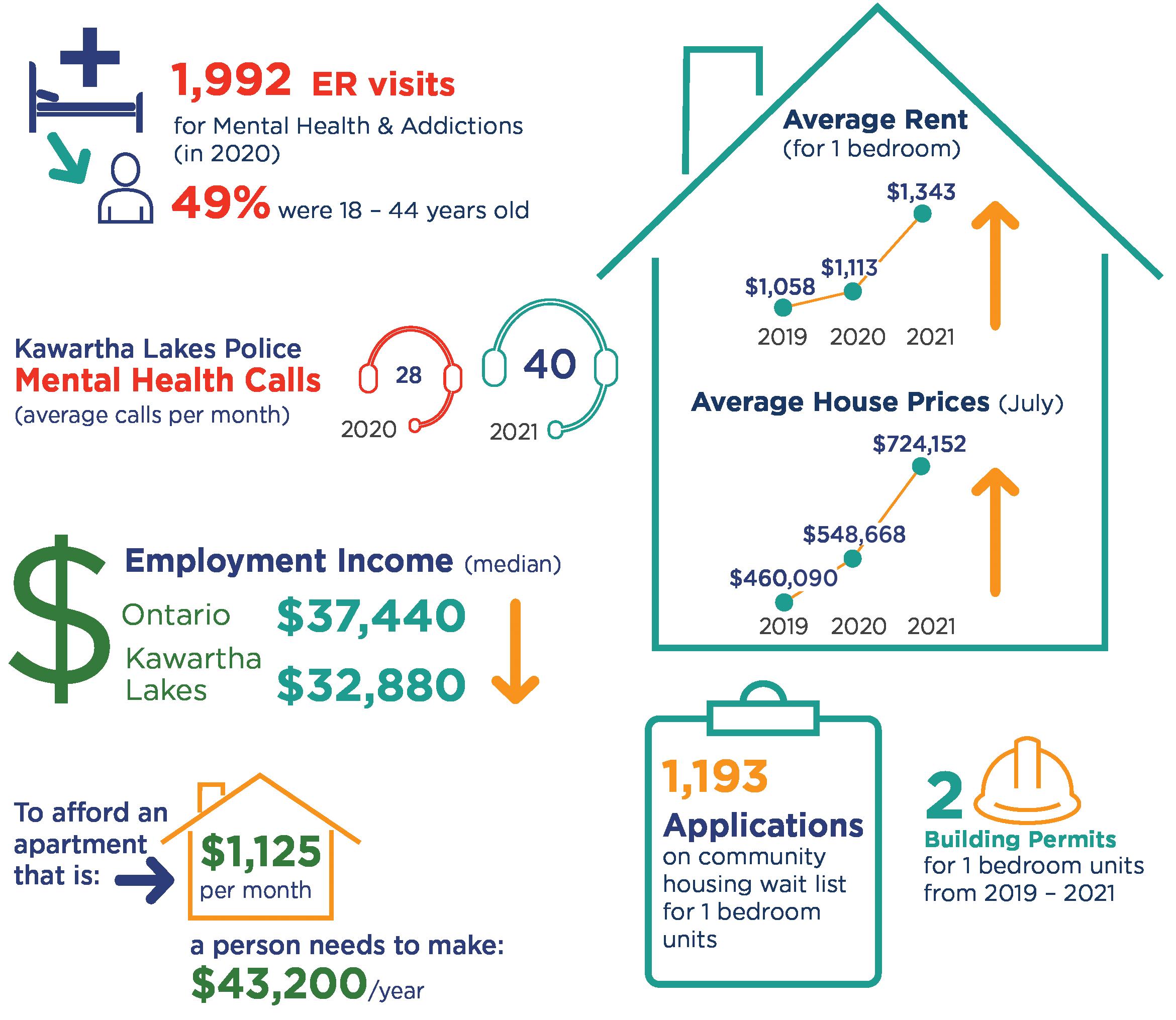 The primary focus of a Community Safety and Well-Being Plan is to address the social issues that can impact the overall health of our community. After considering all of the information collected, the advisory committee chose Mental Health & Addictions, Housing, Poverty and Youth as four priority areas for Kawartha Lakes. In the pages that follow, you will see how we arrived at those priority areas and the strategies planned to address them. These are very complex issues and positive changes will require a concerted effort over a long period of time.