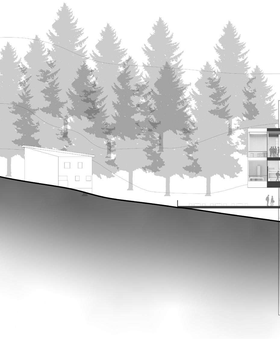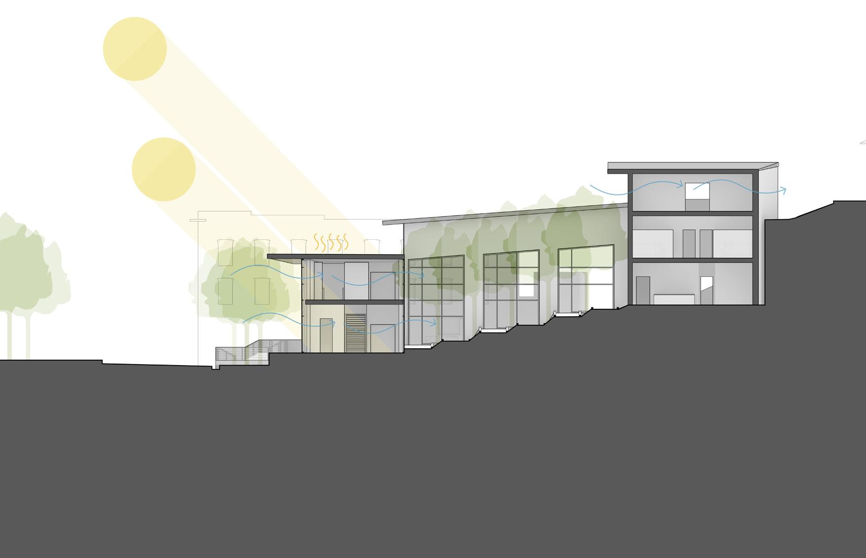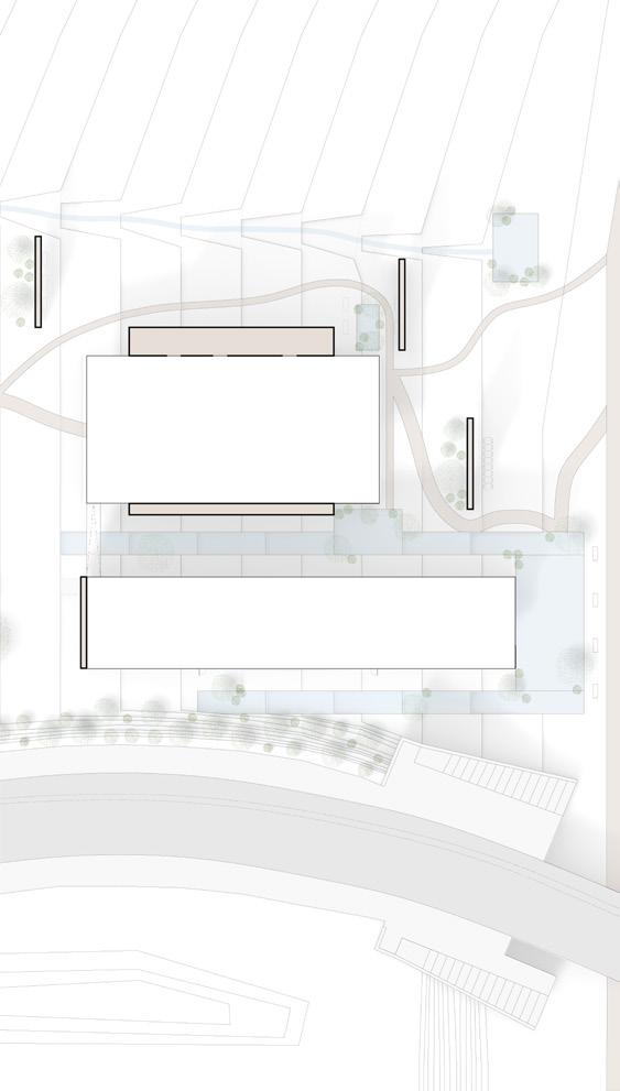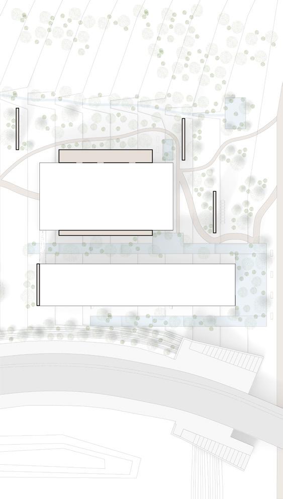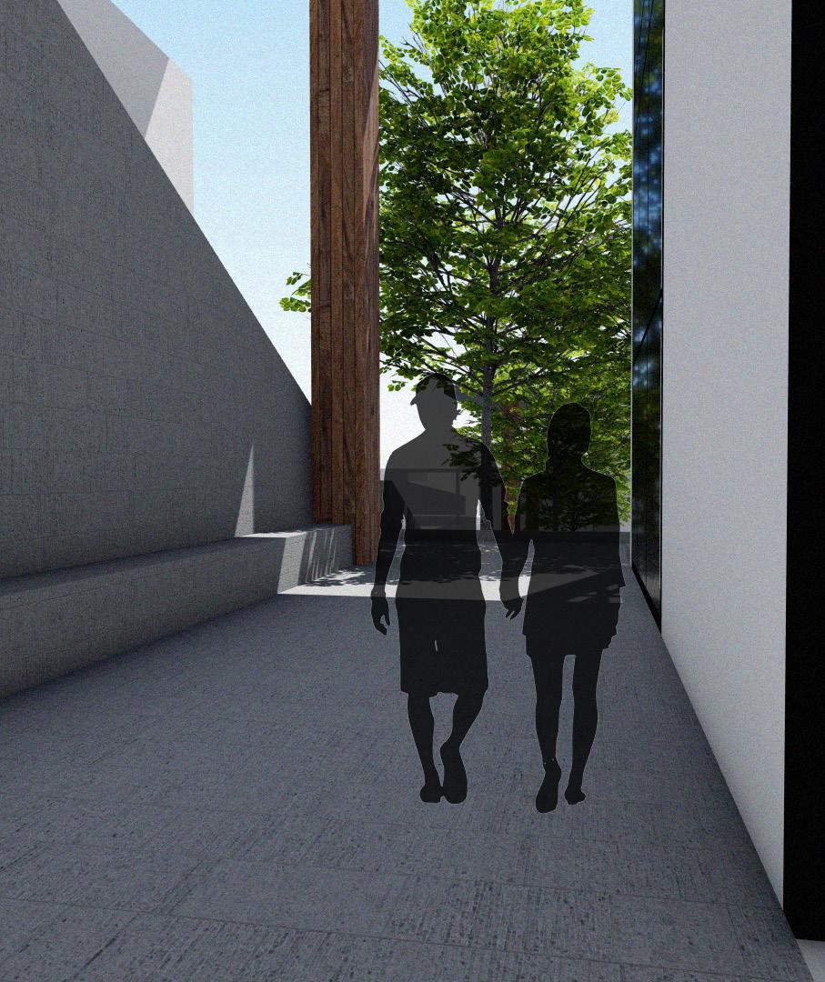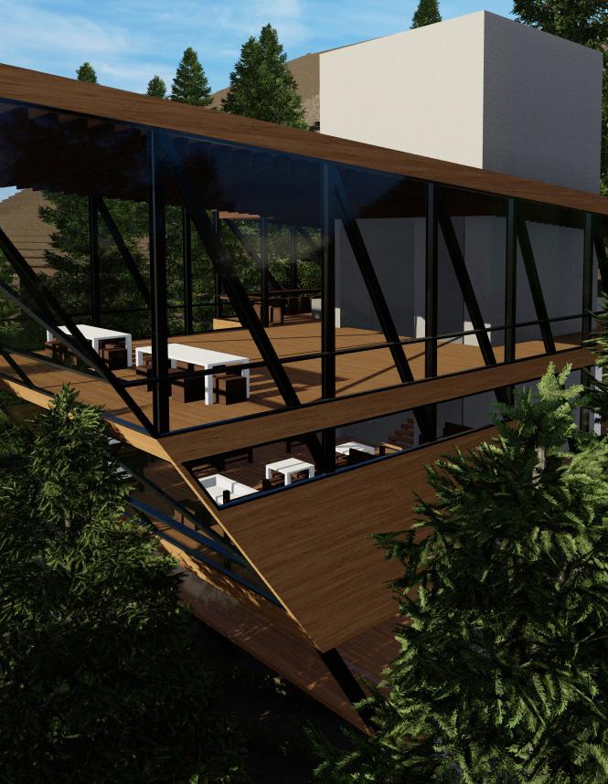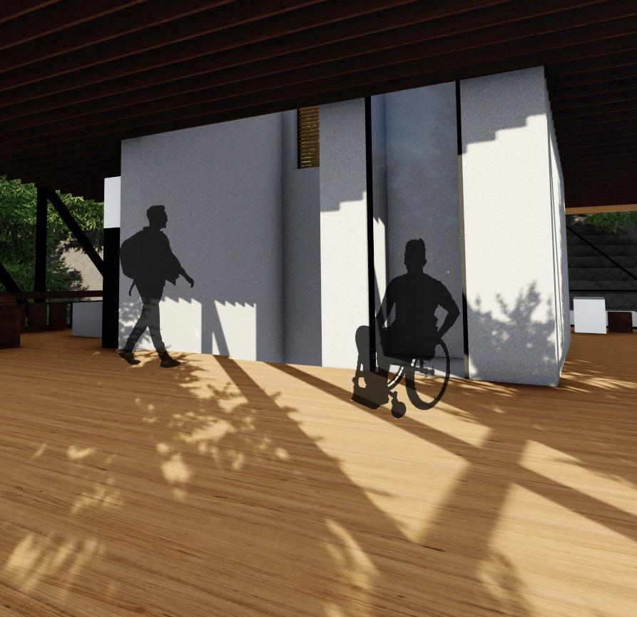 The community and retreat center is designed for all users to have an equal opportunity to experience the individual space while being immersed into nature when circulating. A series of low physical effort ramps were created to connect the structures and allow for meditative and reflective moments while going through the site. Storefront facades welcome users into interior spaces by revealing a sense of clarity between the interior and exterior. Roof overhangs connect the three structures in the design but also interact with the existing structures. The design welcomes the community to grab a cup of coffee at the walk-up coffee shop, take part in the activities being held or to simply meditate on their own. Every visitor’s journey will be different but they are all connected by the equal opportunity to experience it.