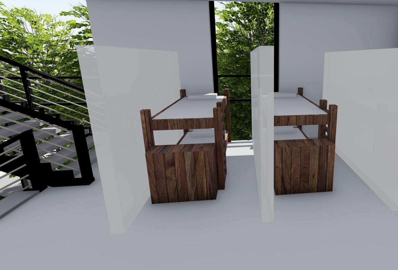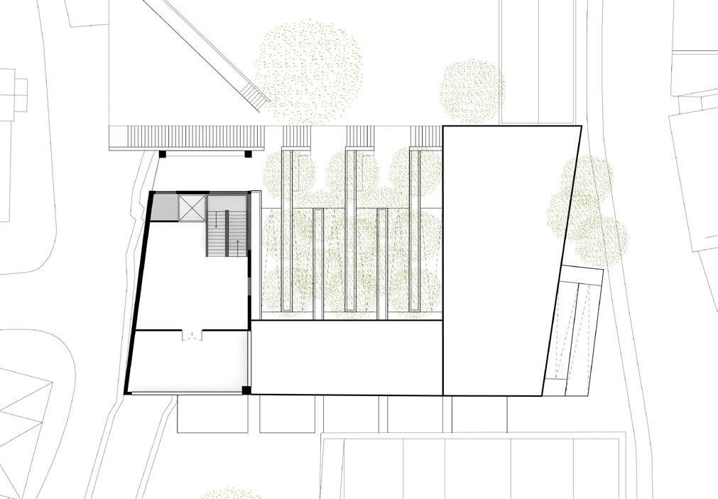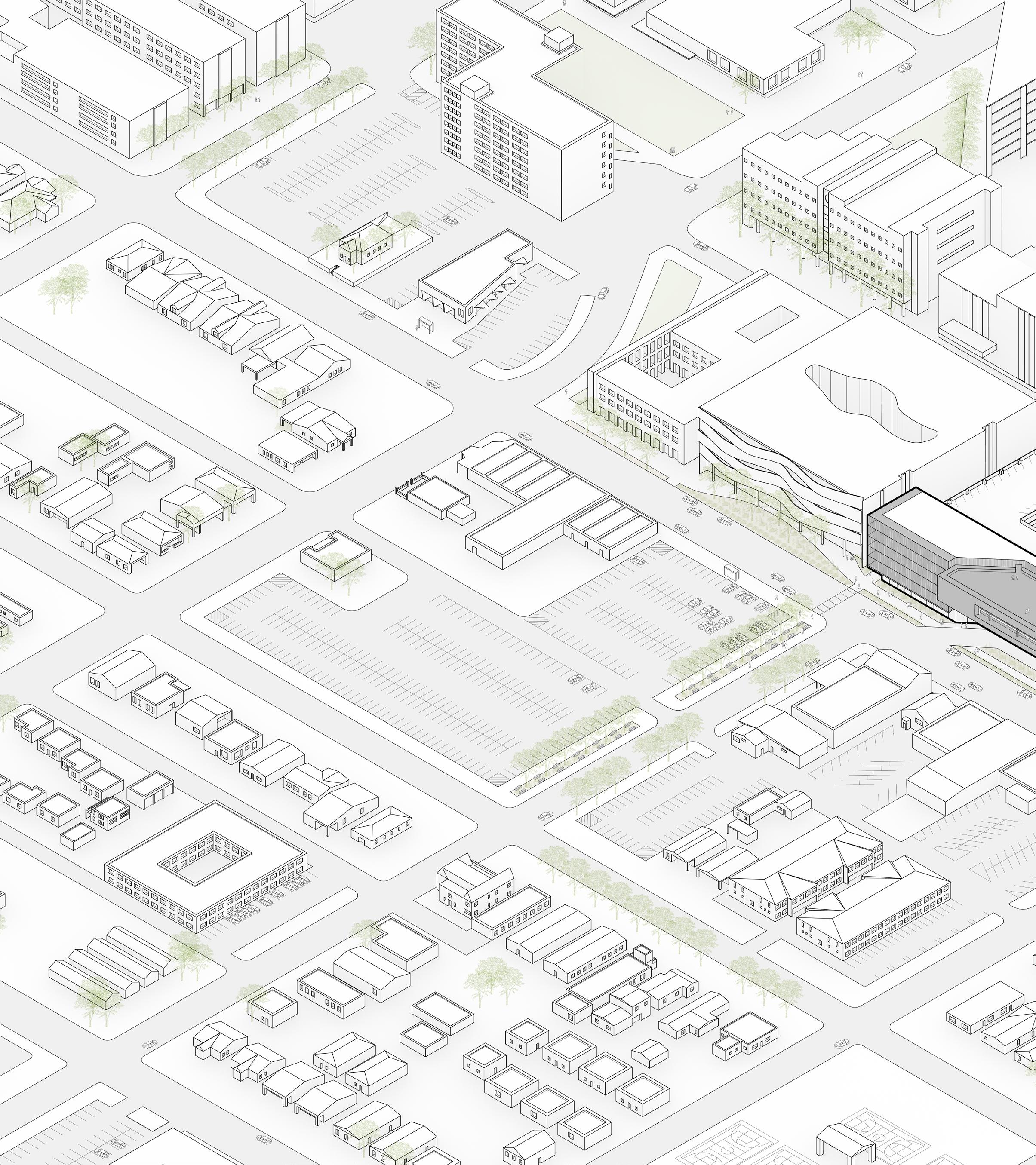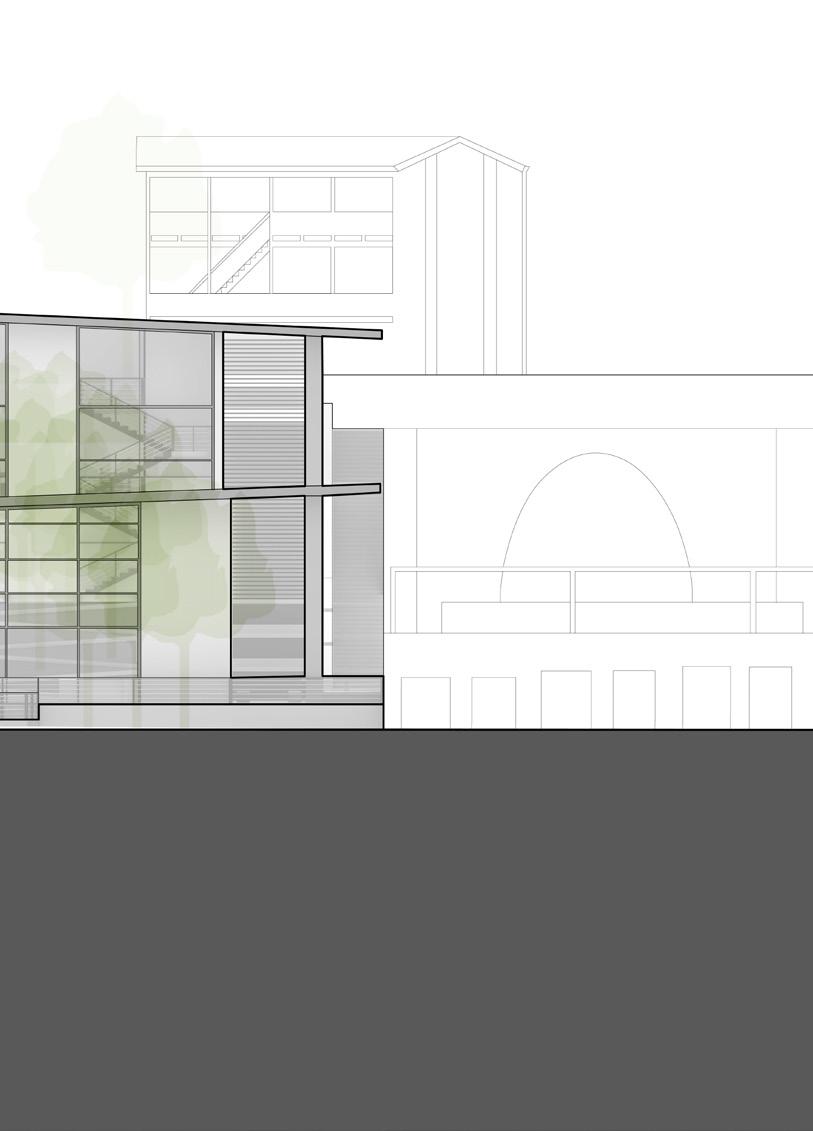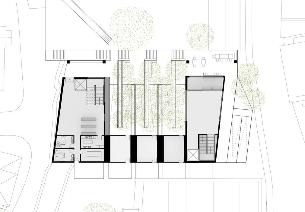 The community and retreat center is designed for all users to have an equal opportunity to experience the individual space while being immersed into nature when circulating. A series of low physical effort ramps were created to connect the structures and allow for meditative and reflective moments while going through the site. Storefront facades welcome users into interior spaces by revealing a sense of clarity between the interior and exterior. Roof overhangs connect the three structures in the design but also interact with the existing structures. The design welcomes the community to grab a cup of coffee at the walk-up coffee shop, take part in the activities being held or to simply meditate on their own. Every visitor’s journey will be different but they are all connected by the equal opportunity to experience it.