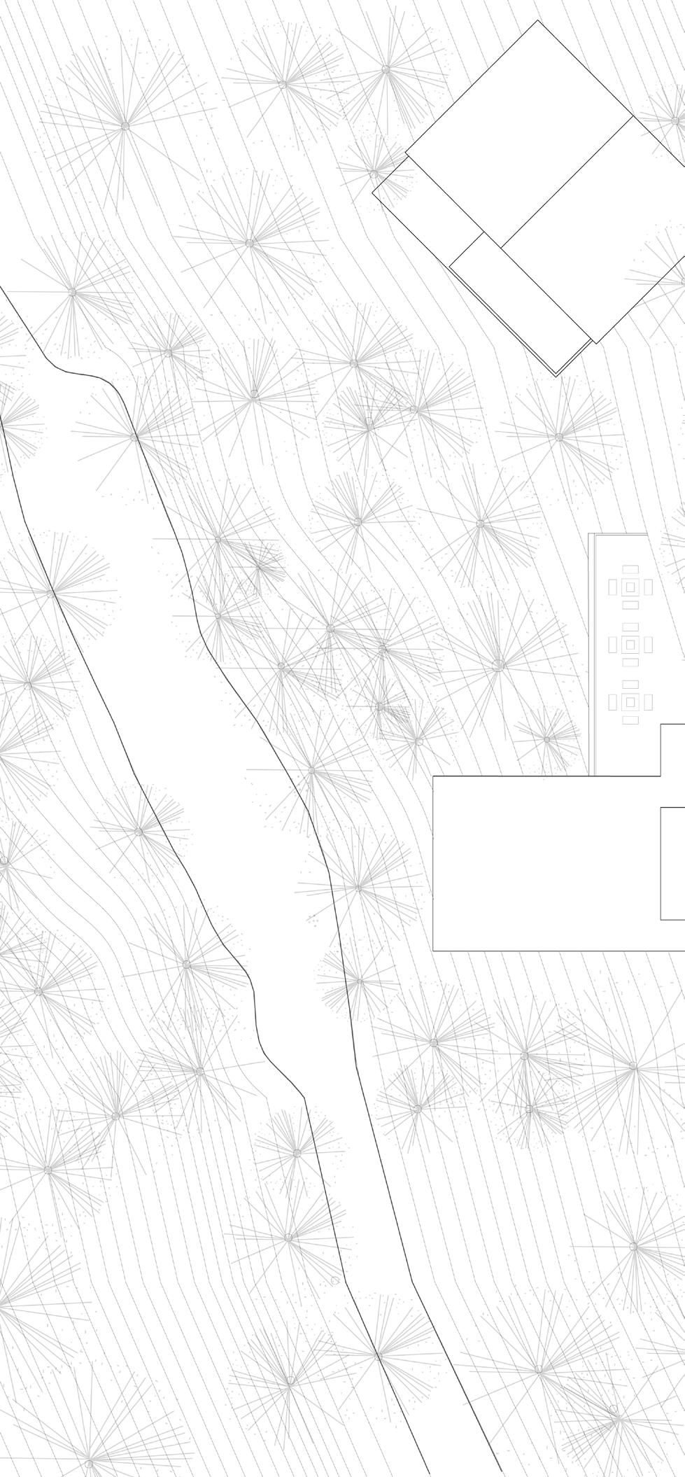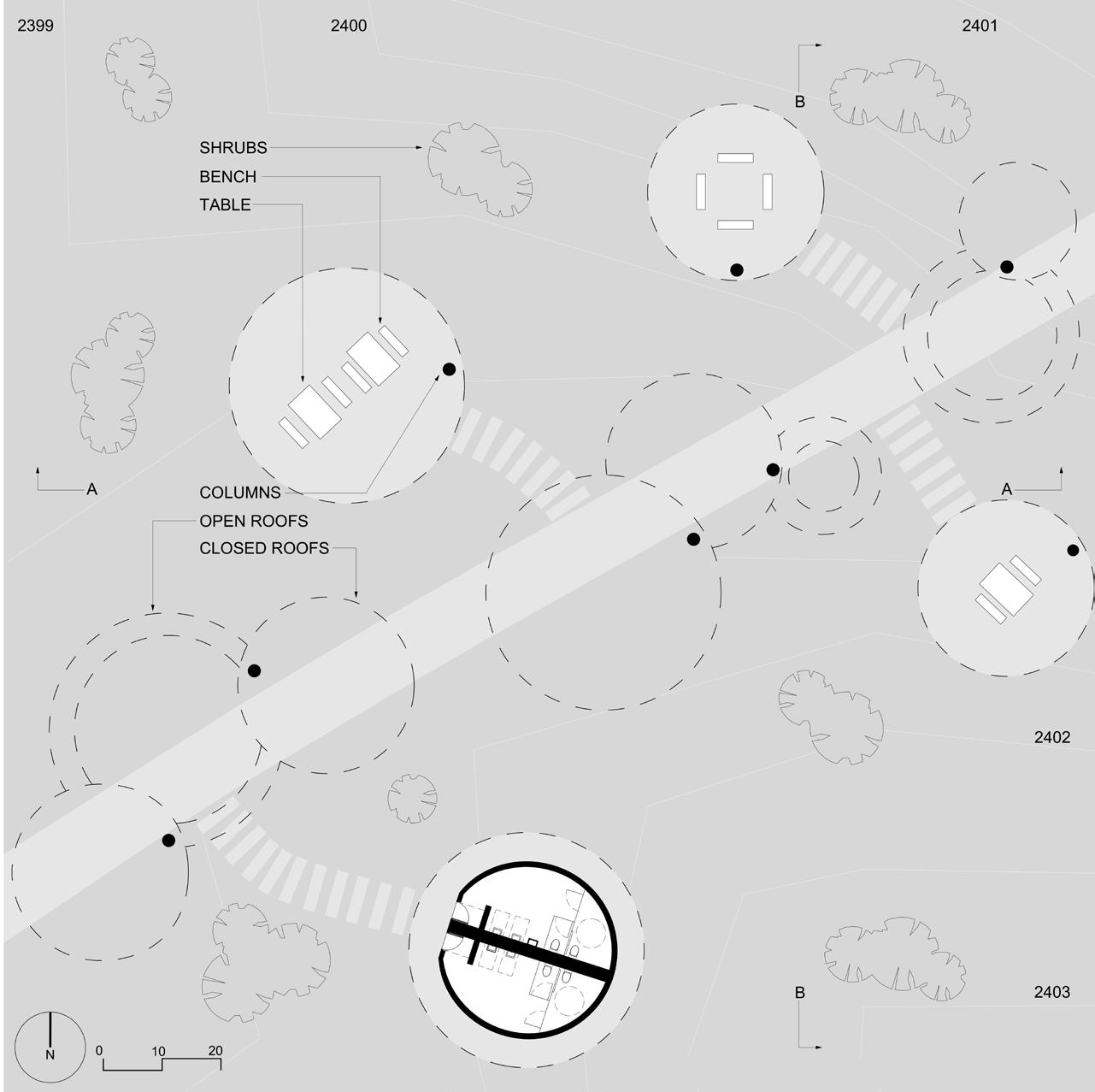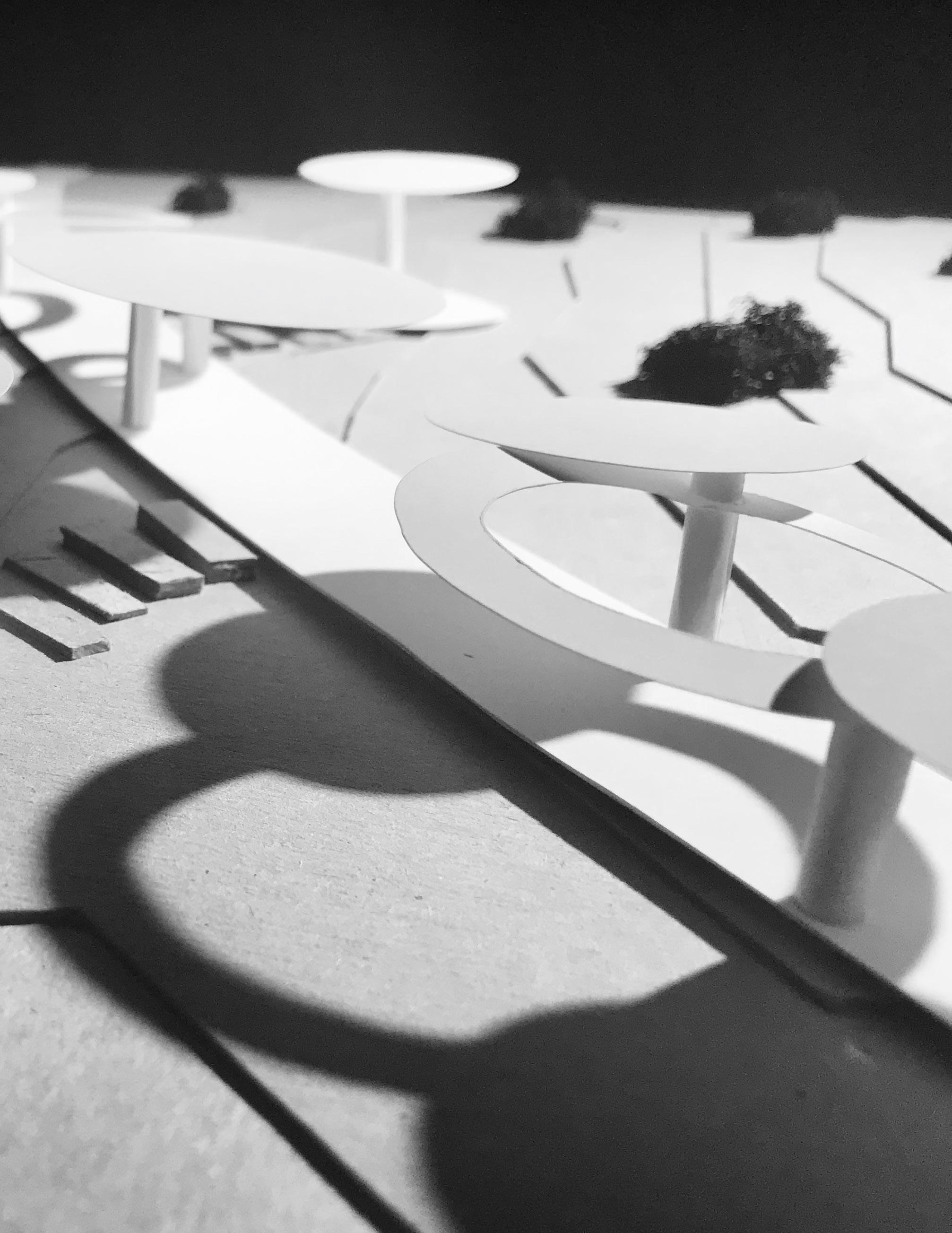 Combining the models of to disarrange, to wander, and nonlinear, the design features a new path through the site to allow for a shaded as well as quicker access to the other side of the existing path. To disarrange is shown through the disarrangement and stacking of the roofs. Some of the structures are pulled apart from the path for inhabitants to take a break from walking/biking. Each disarranged roof features a bench or a table for people to sit, eat, talk or relax in shade with the breeze flowing from the Southeast. To wander is presented through the new path itself, wandering off the existing path and into the new path. Nonlinear is illustrated through the form of the open and closed roofs of the design.