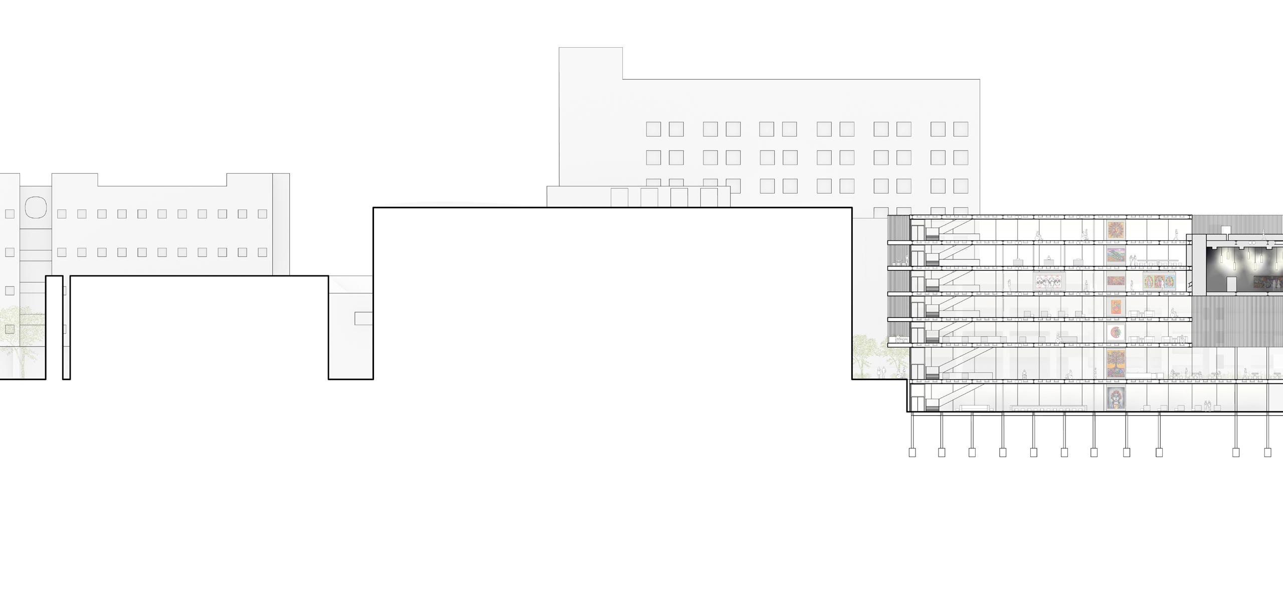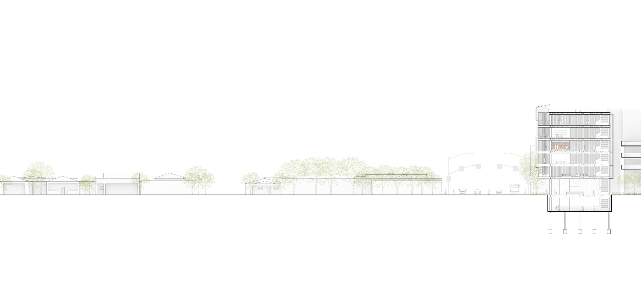 Transcend is on the University of Arizona campus and is directly adjacent to the 6th Street parking garage and ENR2. The study of the urban fabric as well as the study of Dia de los Muertos shaped TRANSCEND’s form, function, qualities. The circulation of the design creates fluid paths through, to, and around the site, creating livability for all visitors. The two structural systems bring diversity to the building through the use of a concrete-enclosed, cantilevered space that sits within a glass enclosure; symbolizing the souls who have passed being brought back to life by the living. The continuous steel structure and accommodation for all users being vitality to the design through both physical and functional strength. The design serves to create a juxtaposition between life and death, light and dark, and light and heavy in a simple but intuitive way that bring viability to the design in a direct connection to the site. Dia de los Muertos is a time where souls who have passed go beyond their world into the physical world just as TRANSCEND surpasses its limits through form, cantilevers, and materiality.