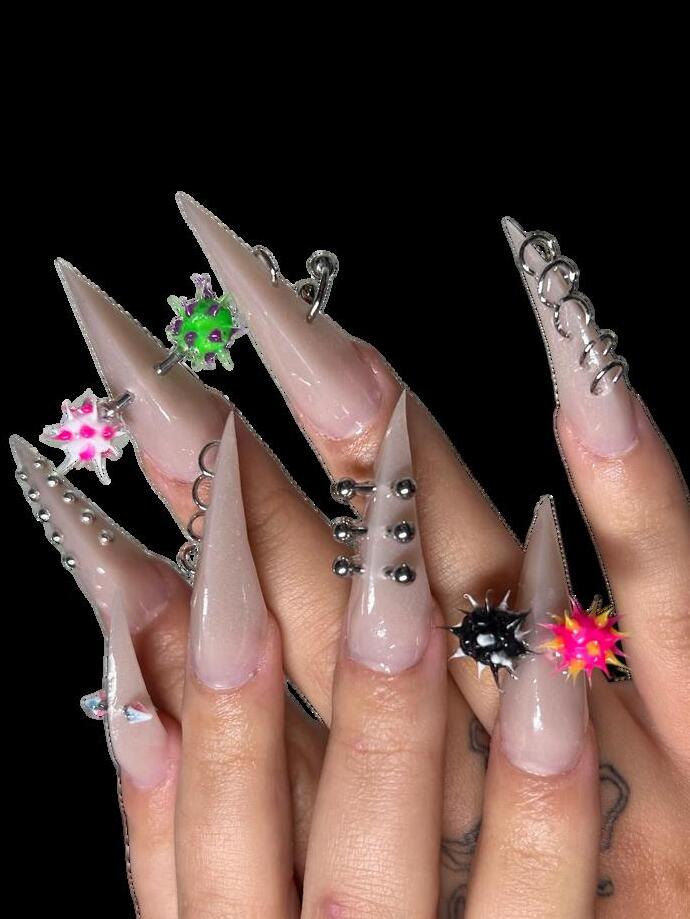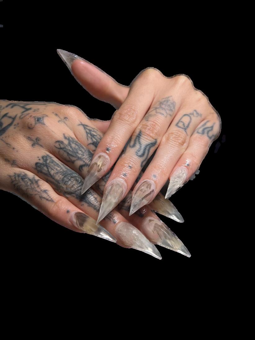 textures and shapes with 3D sculptural gel. She mainly specializes in claw nails which are formed from polygel and extension stickers. This nail shape was created and popularized by Marggie Nails and other Russian nail artists. She loves experimenting with encapsulating different designs within the claw nails and perfecting its geometric form. In addition to cat claw nails, she also uses 3D sculpting gel for nail art which allows her to create objects like a pierced orchid and fish bones on nails. This new medium transforms nail art from the 2D to 3D and since she also loves sculpting and ceramics, this was the perfect blend of two mediums.