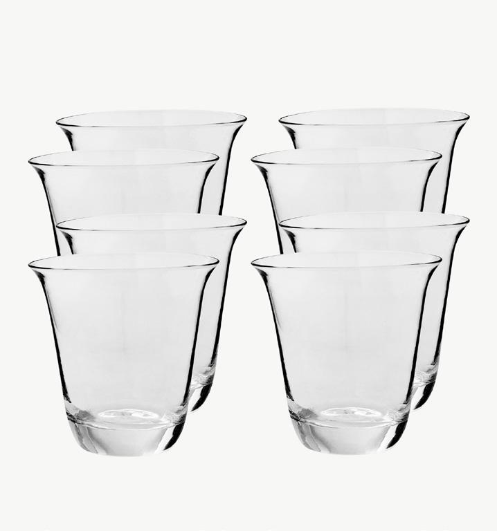 Kay Bojesens glas er mundblæst i en særlig triangulær form, som ikke kun er betagende at se på, men også exceptionelt behagelig at drikke fra. Glassets unikke formgivning indfinder sig perfekt i håndfladen og sikrer en oprimeret drikkeoplevelse, både som vandglas i hverdagen og til festlige drinks. Glassene er stabelbare og tåler maskinopvask.