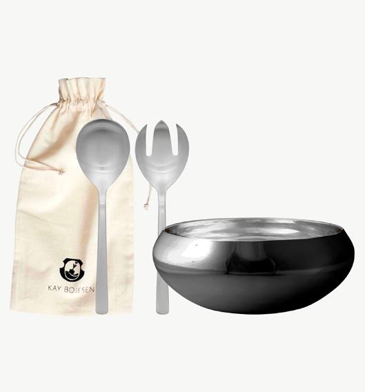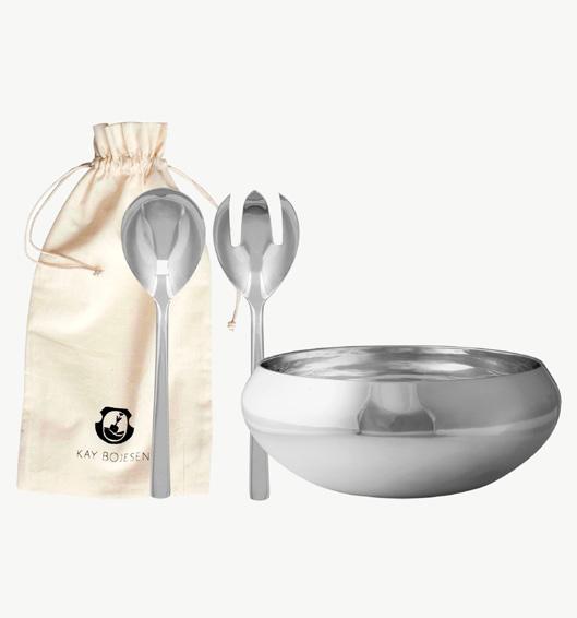 Kay Bojesens helstøbte designunivers kommer særligt til udtryk i denne gave, som kombinerer et af hans funktionalistiske designs til bordet med det prisvindende Grand Prix bestik. Det komplette sæt med skål og salatbestik er både indbydende og højfunktionelt. Vælg mellem det matte sæt eller det blanke sæt.
