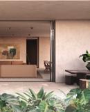 On the ground floor, which is slightly sunken into the landscape, two-bedroom apartments starting at 176sqm are accessed through private entrances. The bedrooms are minimal, restful spaces, with reading nooks built into floor-to-ceiling glass windows that look out into cosy private courtyards. Here, lush greenery plantings create a sense of harmony between outside and in. The apartments also offer open living areas and kitchens as well as outdoor cooking and dining areas.