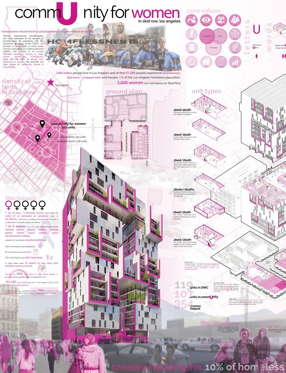 If we had to single out an issue related to architecture and the built environment as causing social distress in the US, the lack of access to adequate housing would arguably be one of the strongest candidates from any reasonable perspective. Some of the most dramatic societal problems in American cities from homelessness or gentrification to inequalities of opportunity in education and healthcare—are, at least partially, caused by the current housing affordability crisis and the displacements it creates. However, very little of the innovative drive of architecture, as an academic discipline and a profession, is used to imagine alternatives to the current situation. While plenty of policy think-thanks, urban planners, and social science scholars are proposing strategies, plans and ideas to combat the housing affordbility crisis, the dominant architectural discourse largely ignores this issue. In my exit studio for undergraduate, my partner and I chose to combat this Skid Row in downtown Los Angeles is a national hub for homlessness, where women especially are at a disadvantage as they try and re-enter society.