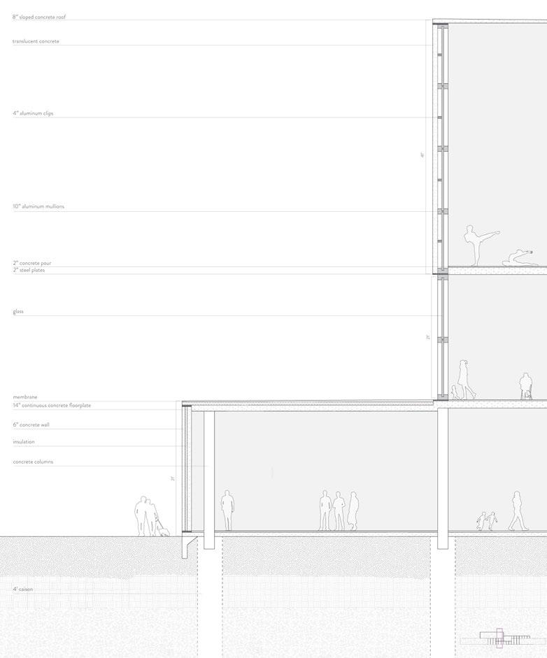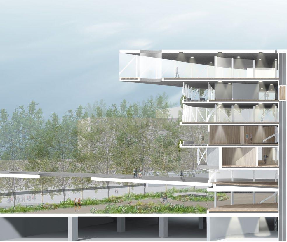 Through the section and elevation, we can get a better look at below ground floor, where we have the first floor of the archive, where artifacts are delivered and processed to be stored below. The relationship with the gardens and bridge and the building that provides the connection. Looking inside, there is the stacking of horizontal platforms, or grounds, and how the program assigned to each floor changes how closed off or open that floor presents itself. We can also see the different types of terraces provided and how they adapt to the activity on each level, whether that be private or public. The very top floor which acts as the event space provides substantial views of the city, including the nearby parks and the beach.