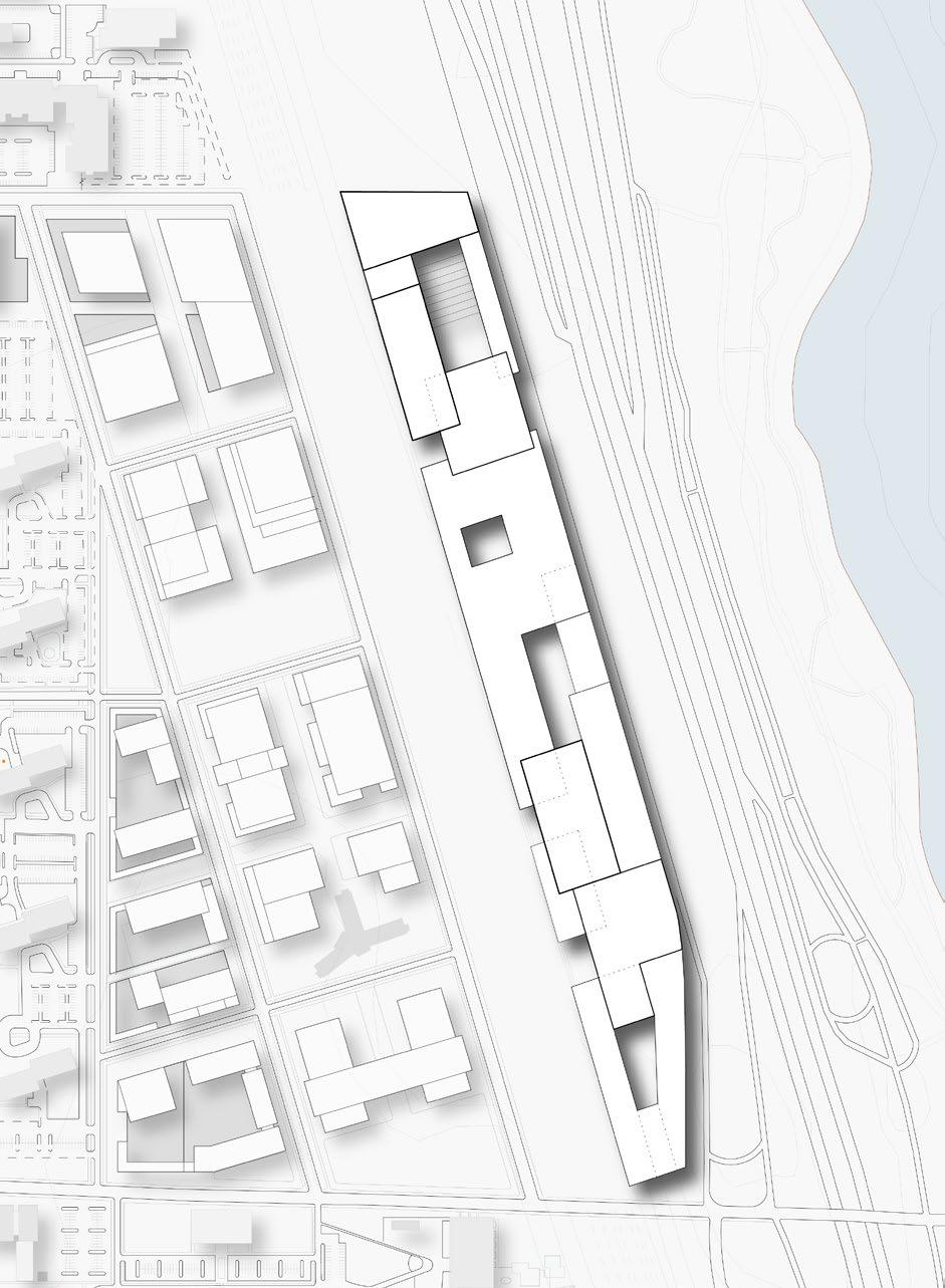 Our building is designed as a hub of connections that bridges the fragmentation present around Bronzeville. We wanted to encourage interaction among the public through our circulation while also addressing the desire for cultural spaces that will be managed and run by the community. The proposal not only physically bridges the neighborhood together, but also socio-culturally. By grafting “the Stroll” which was a prominent block of jazz clubs during the 20th century in the Bronzeville neighborhood, we have regenerated a safe, inclusive space for the community of Bronzeville, as well as the rest of the south side. Our proposal creates a ground scraper rather than a skyscraper to validate the storefront experience of the many jazz clubs historically placed along the Stroll which ran from 26-39th street. With this in mind, we kept a central circulation route throughout our site which mimics continuity of the archived Stroll. In order to develop a massing, we considered aspects like scale, building heights, surrounding attractions, existing grids, indoor/outdoor spatial relationships, and public transportation accessibility.