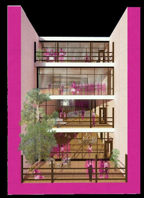 exterior outdoor spaces act as flexible group spaces. here, one has views across the interior atrium as well as to the Downtown Women’s Center.spaces act as flexible group spaces. here, one has views across the interior atrium as well as to the Downtown Women’s Center.