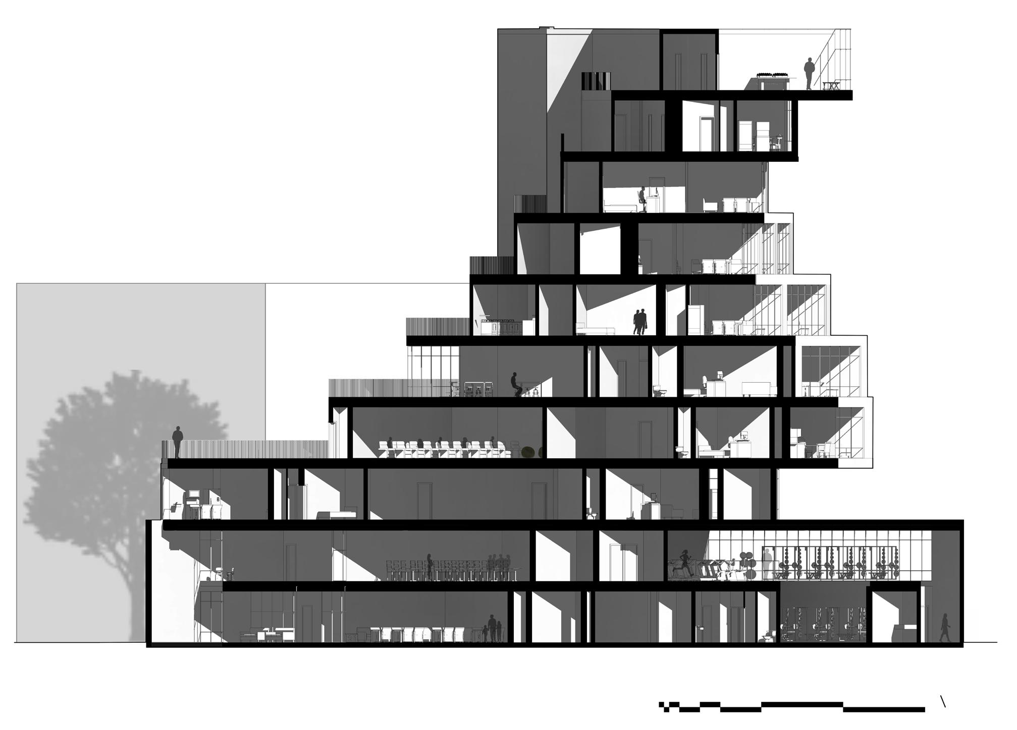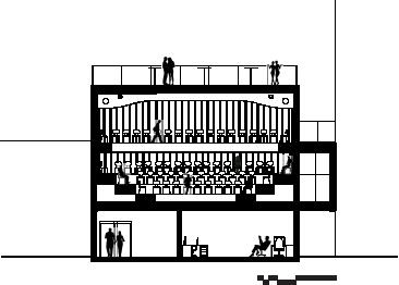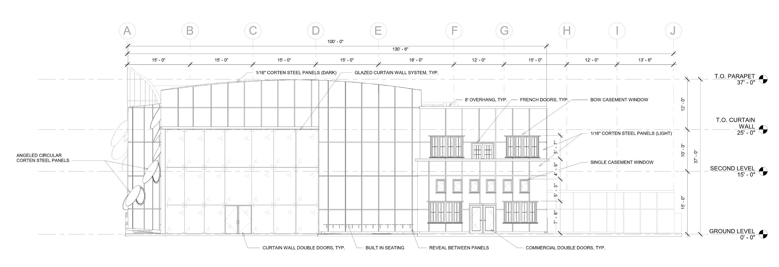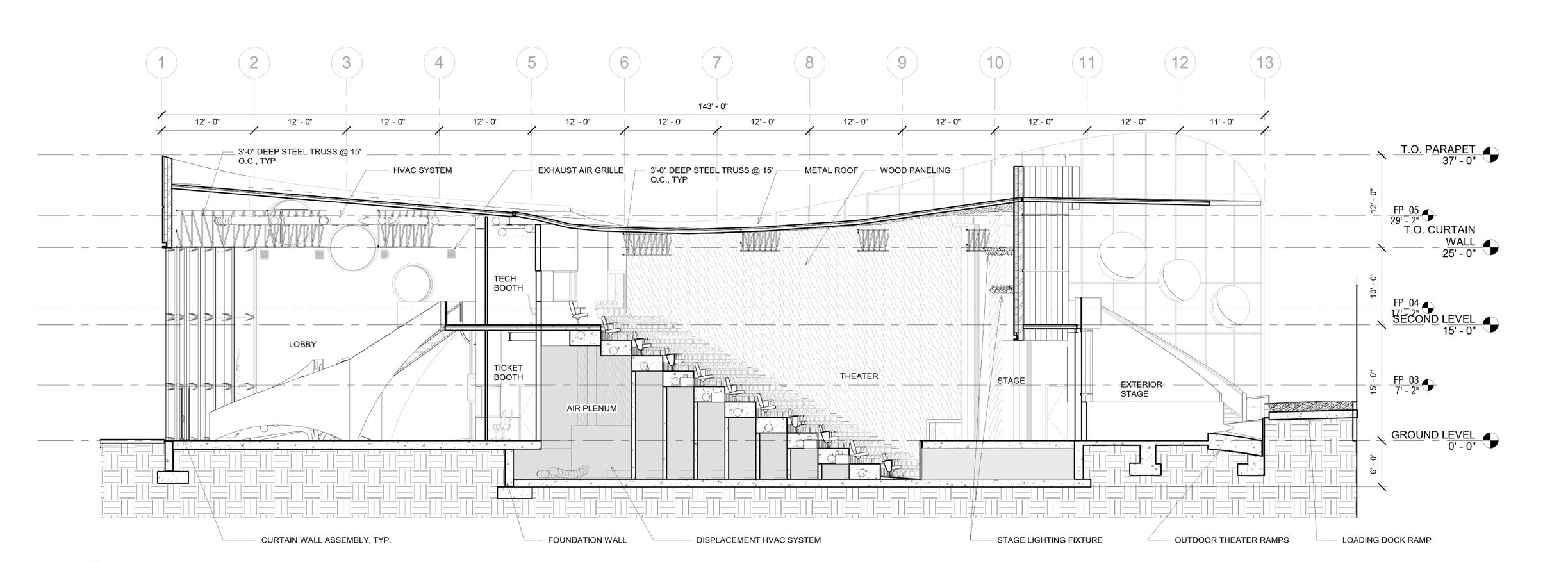 The site for this design is located in Witchita, Kansas on the corner or E. Douglas Avenue & South Broadway Avenue. This design aspires to emulate the contrast between the interior and exterior of a grand piano. A grand piano has a sleek, black finish from the outside, which differs from the warm, soft interior textures. In the same light, this design has a smooth, black exterior on all facades, but consists of warm tones on the interior with red velvet and glue lam wood finishes. The cat walks, glu lam curves/cut outs, as well as the stacked seating of the theater are derived form the construction of the grand piano. This design offers offices, lounges, theater/rehearsal space, a resturaunt, and rooftop bar/ overlook.