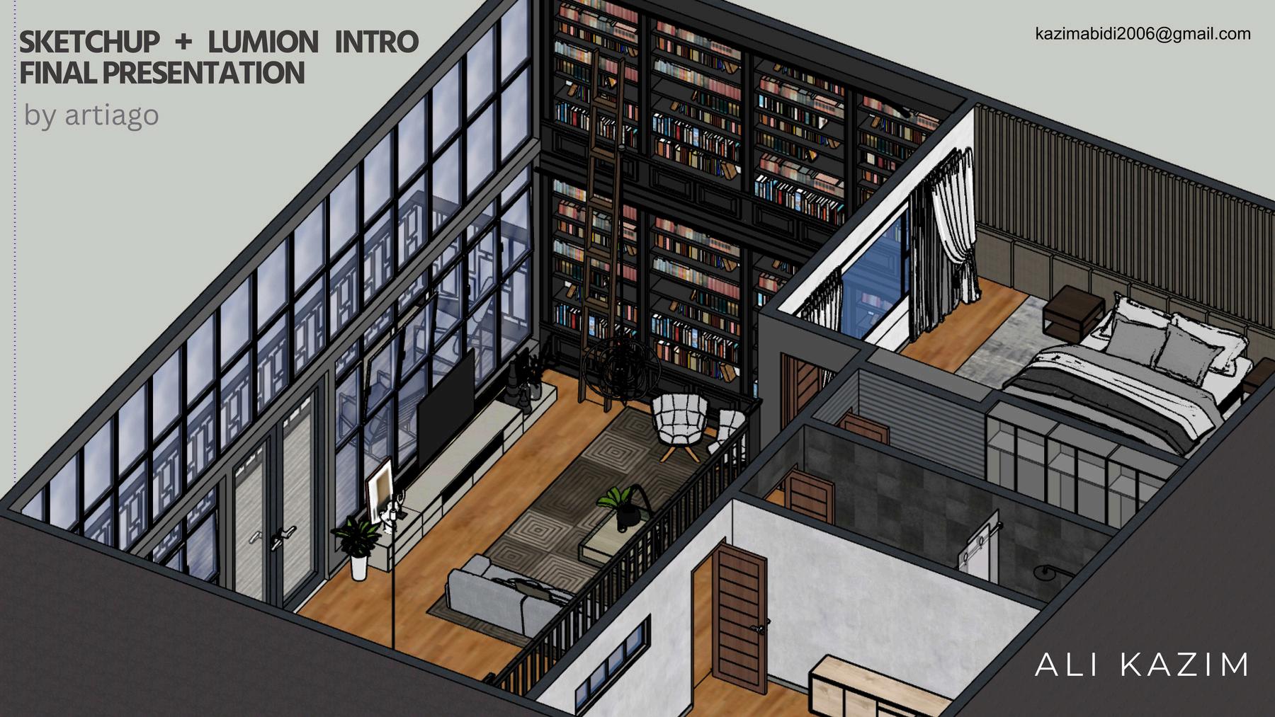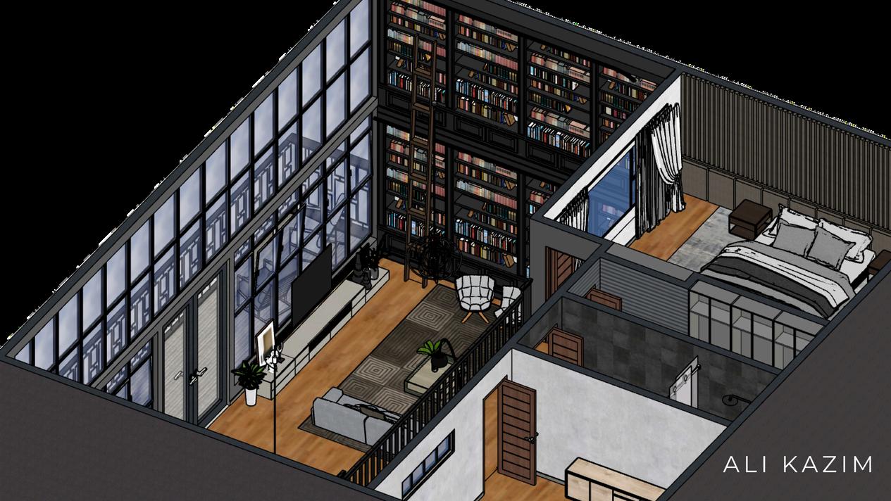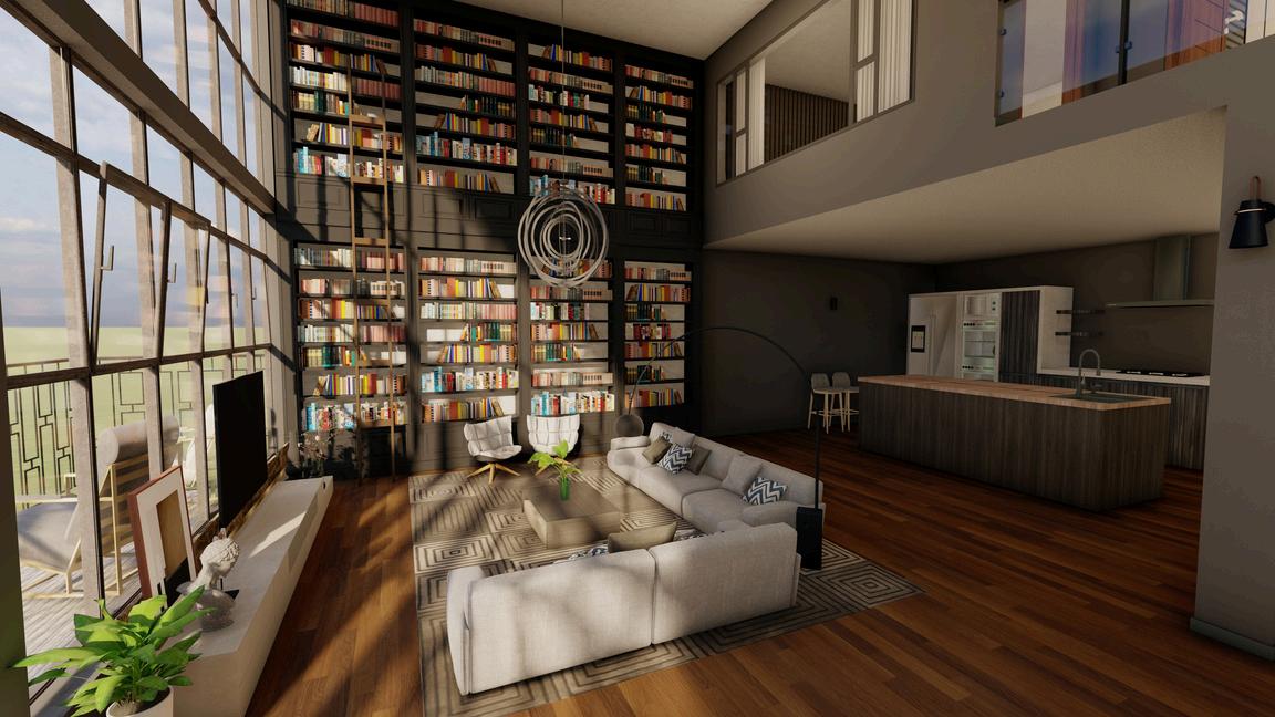 A spatial visualization for a client relocating to a new apartment, focused on how their existing furniture could adapt within the interiors. The design explores an open-plan living, dining, and kitchen space, alongside a dedicated library/workspace, bedroom, and modern bath — emphasizing flexibility and comfort in a contemporary setting.