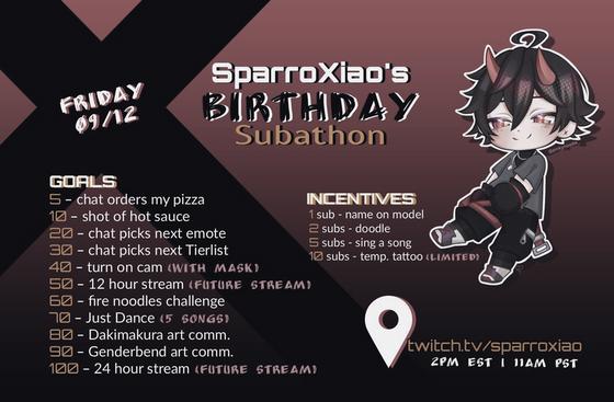 SparroXiaoBirthdaySubathon CongratulationstoSparroforhittingallhissubathongoals! Staytunedforafuture12-hourstream&24-hourstreaminthefuture!