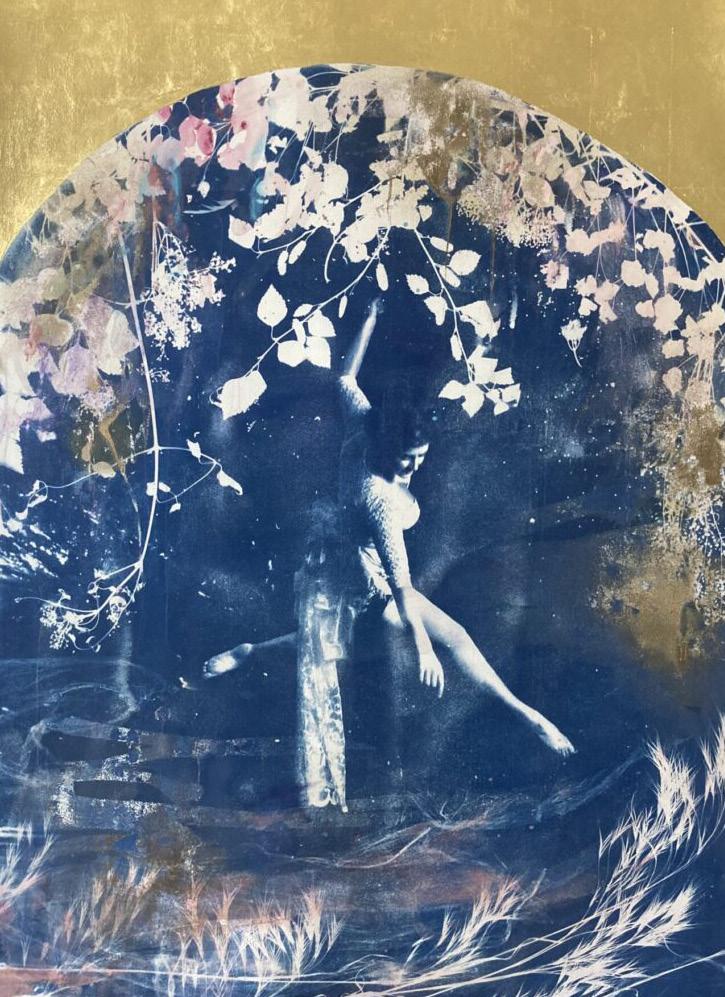 “Leap” by Rosie Emerson begins with photography of dancers and performers, then evolves through layered additions of pressed flowers, grasses, and ephemera gathered from both her studio and the wild.