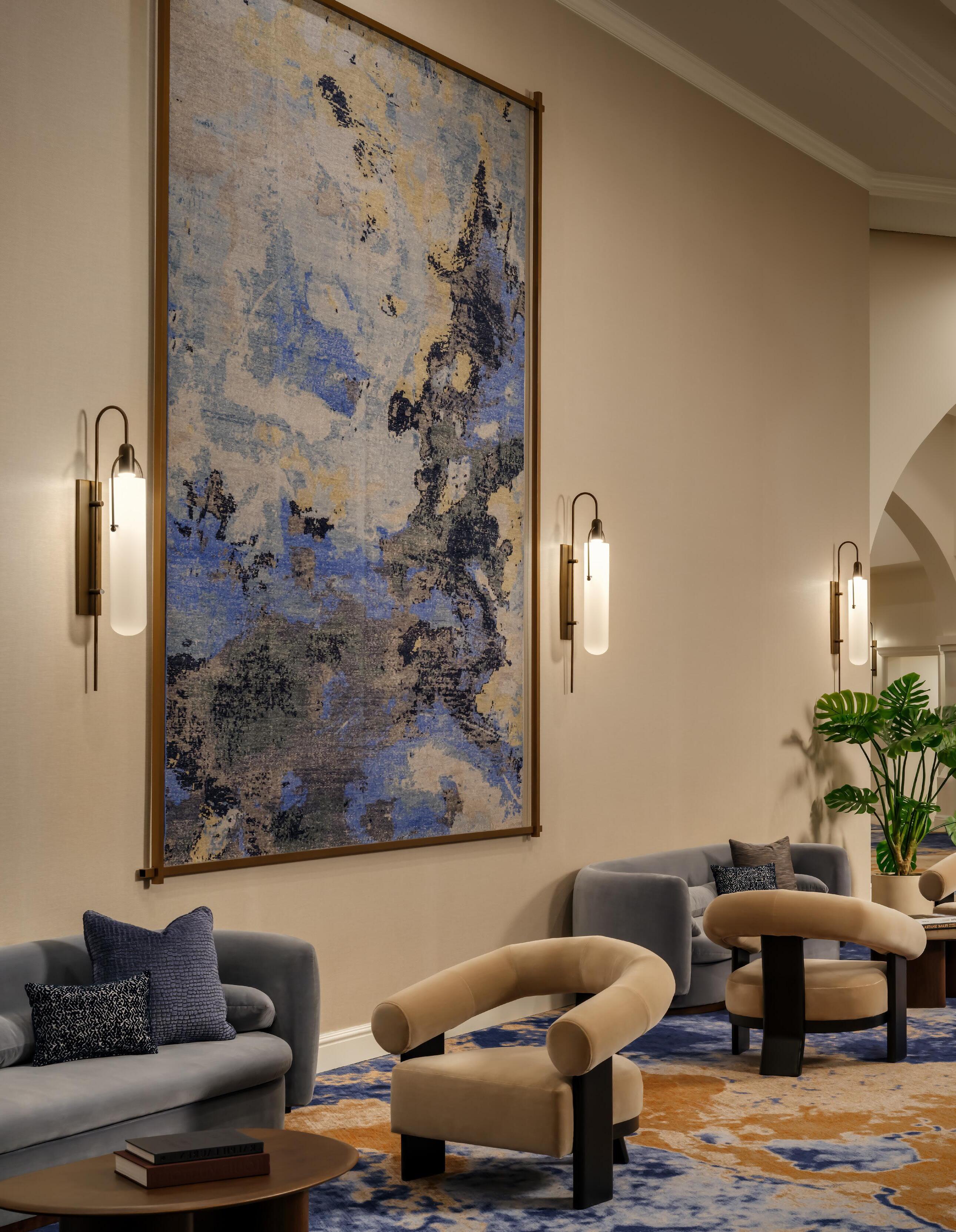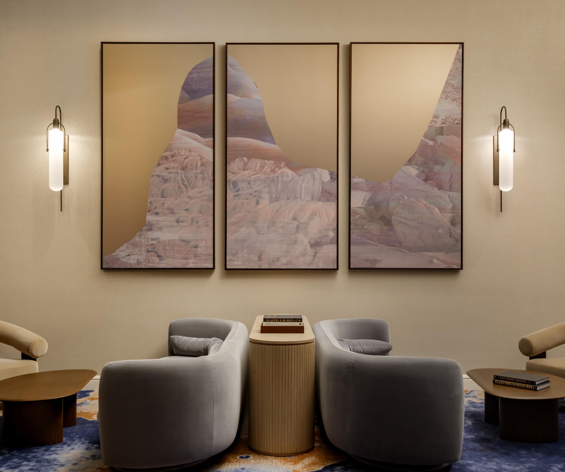 Our art advisors embraced bold proportions throughout the expansive resort and spa, allowing larger works to anchor key spaces. Several pieces were designed by our internal graphics team, including the triptych shown above, printed on an aluminum substrate. Reflective materials were purposefully selected to emulate the qualities of desert sunlight and the openness of the surrounding sky.