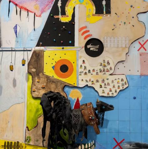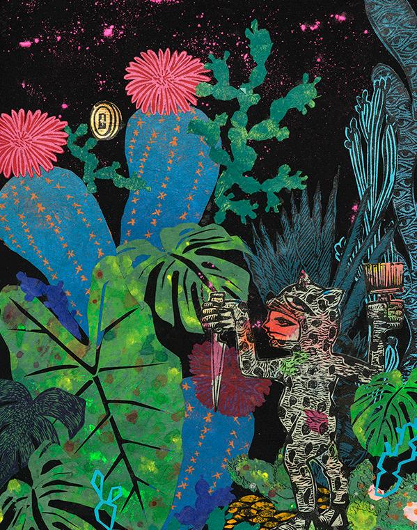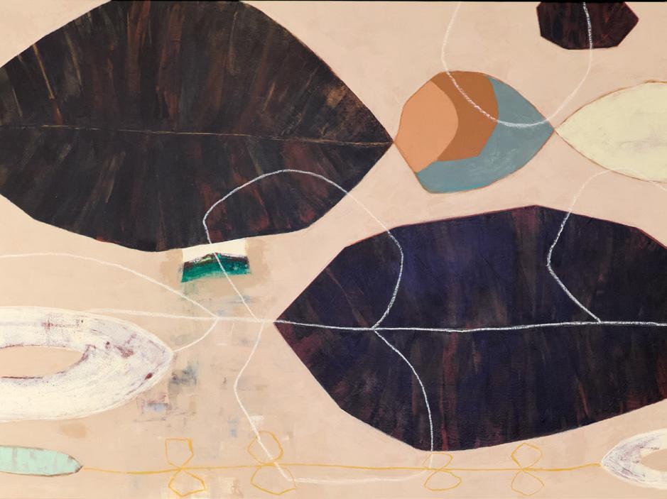 Through layered paint, collaged litter, gesso, and gel medium, she creates abstract compositions that reflect nature’s resilience and capacity for renewal. The intuitive use of color and form evokes elemental forces, with specific black shapes symbolizing aspects of nature, such as the sun.