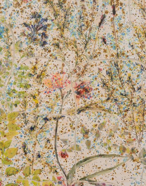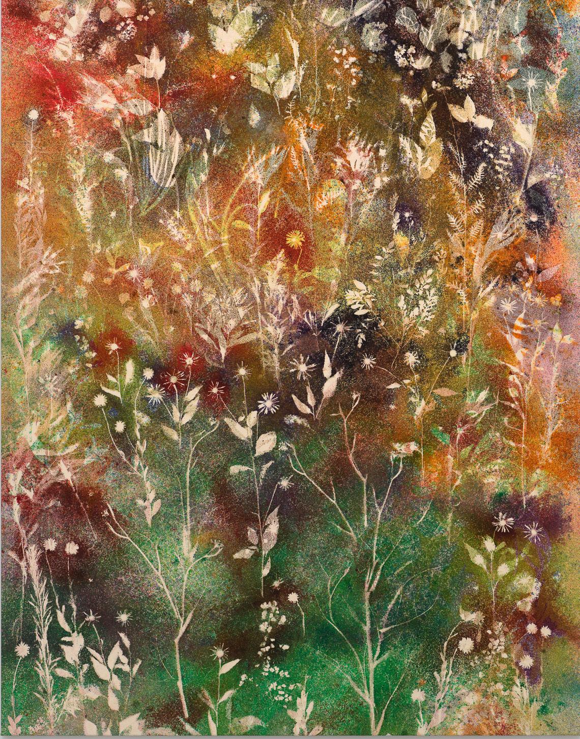 Sam collaborates with nature in the truest sense. He lays large canvases outdoors and arranges local organic materials directly on the surface. Native wildflowers, invasive weeds, and grasses from historic farmland often catch his eye. After positioning the plants, he throws pigment into the air above the canvas, allowing wind conditions to shape the result.