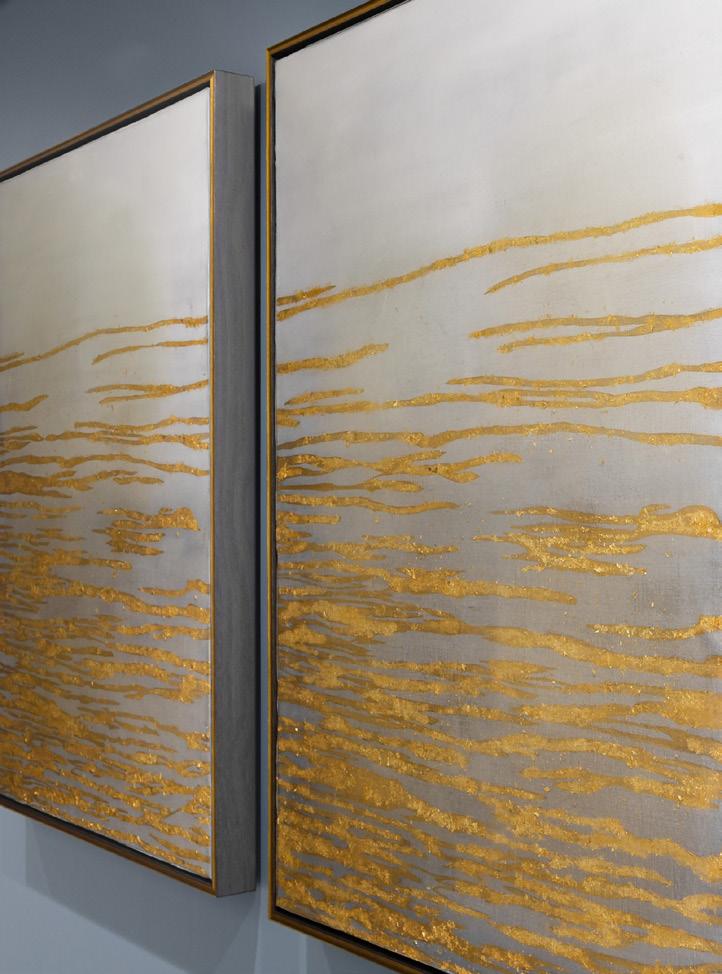 To the left, a striking work by Italian artist Luca Brandi offers a more personal interpretation of place. Drawing a connection between the mountains of his native Tuscany and the vertical formations of Red Rock Canyon in Las Vegas, the piece features a giclée on gold mylar wrapped canvas that creates a subtle shimmer. Nature serves as a continuous source of inspiration for Brandi, who views the natural world as an ongoing cycle of life and transformation, a mystery he seeks to explore through his work.