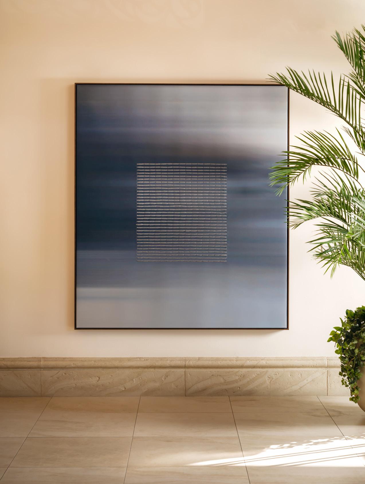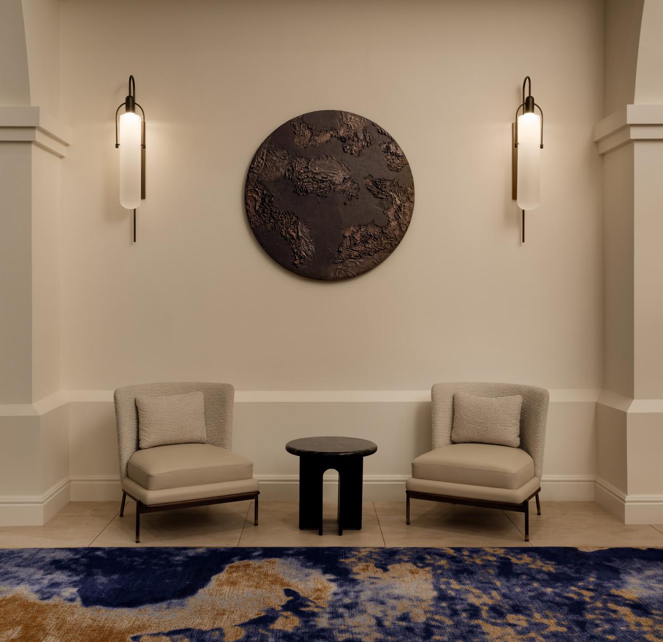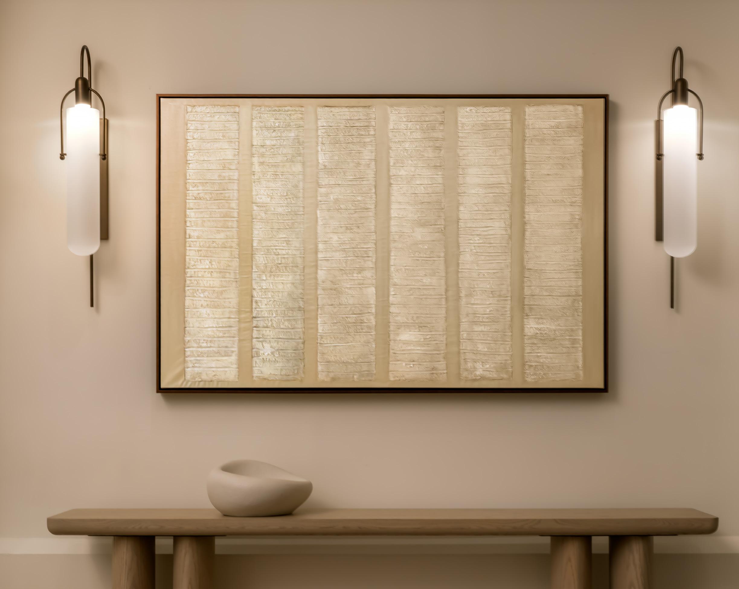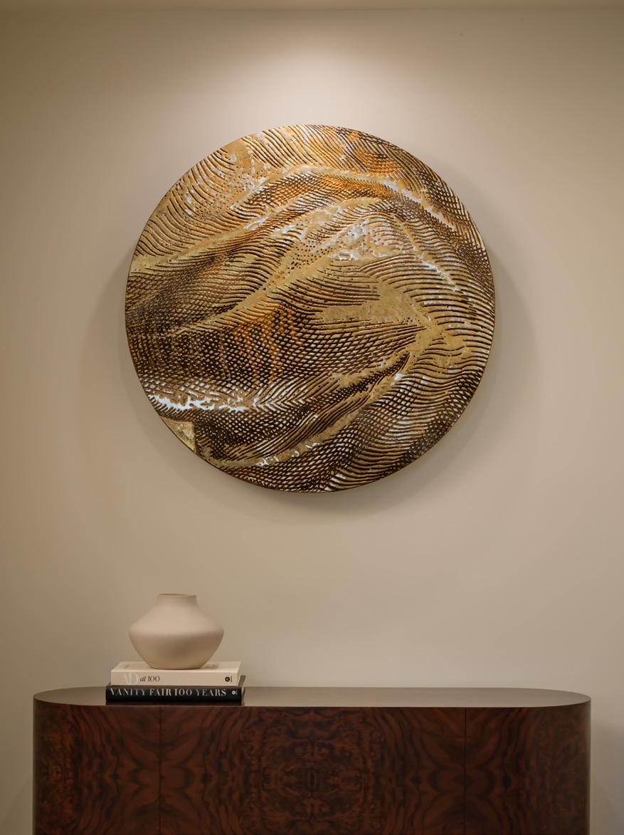 Seen above, KBAA’s custom work “Wabi Sabi” uses linear forms to invite stillness and reflection in an almost meditative mixed media composition. On the right, “Morning Comes” features dusky hues that emulate the shifting light and subdued blues of the desert at dawn and dusk. Alan Alldredge’s textural circular panel introduces shimmery, windswept textures that reference the wind-worn rocks and sands of the Mojave Desert.
