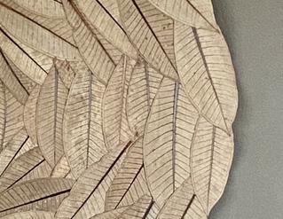 Paris-based artist Alyssa Jos transforms street-collected leaves into intricate, eco-conscious artworks. Rather than allowing these materials to be burned as waste, she preserves the delicate character of each leaf while giving it new purpose. Seen here is a close look at “Half Moon Mirror,” composed of plumeria (frangipani) leaves thoughtfully connected into a unified, sculptural form.