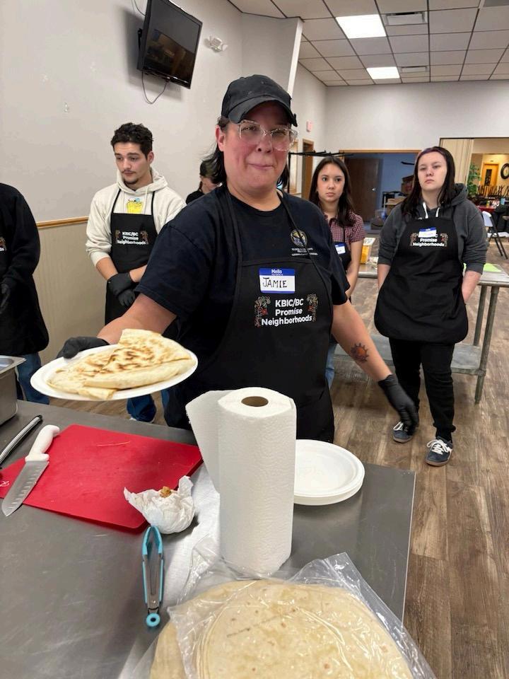 The third seminar, held on February 6, 2026, offered a smaller, hands-on experience with 8 students and 4 staff members. Guest speakers Debra Ross and Jamie Jones guided participants through preparing quesadillas using simple tools and techniques. Students practiced cooking chicken, using proper food handling methods, and assembling meals they could recreate at home. The session concluded with students enjoying their meals and preparing additional portions to share with their families. Participants received The Super Easy Teen Cookbook, a food thermometer, and a KBIC Promise Neighborhoods apron.