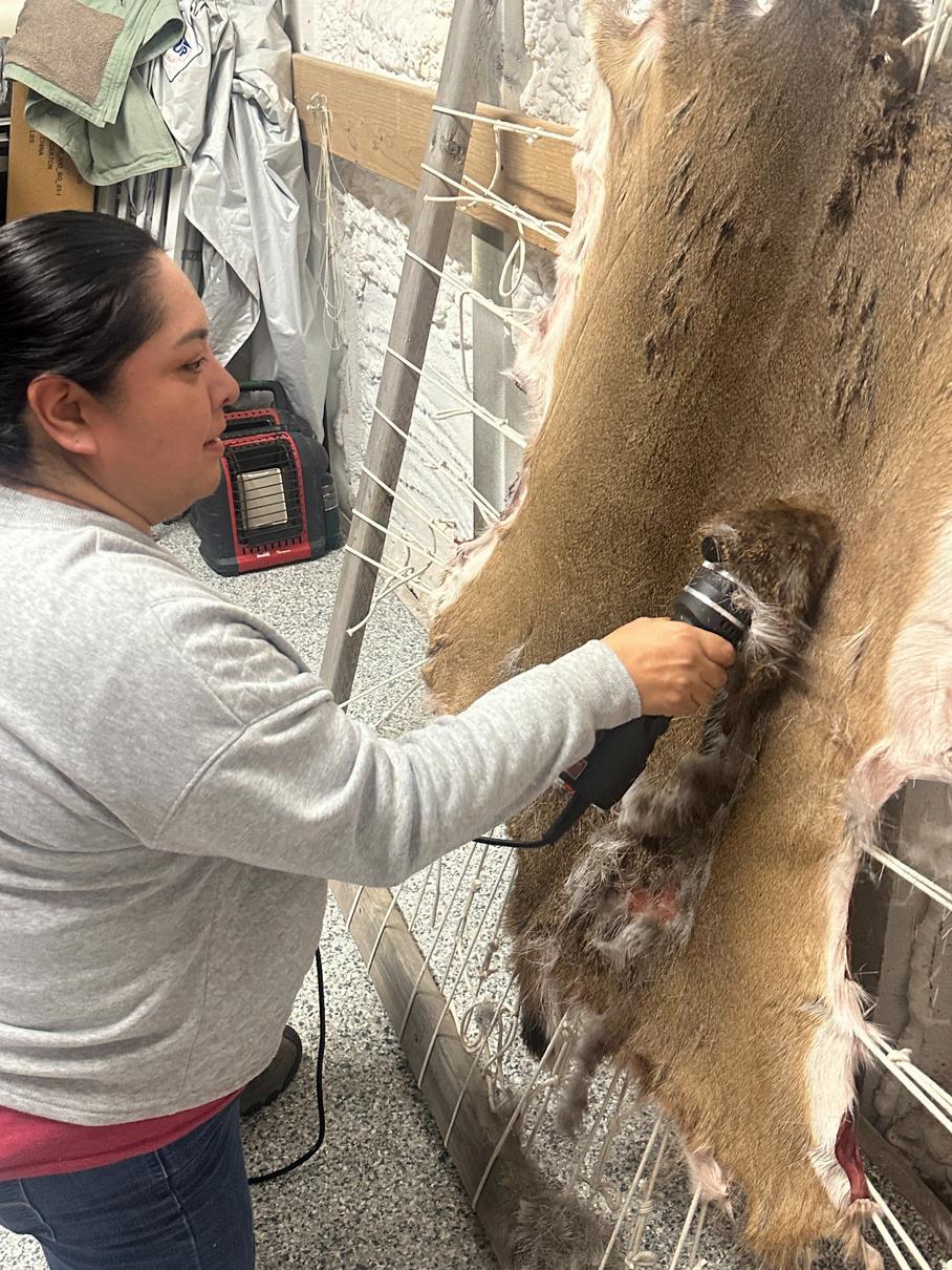 The second day, students from the Baraga Area Schools Ojibwe language class attended and helped string up and stretched the fresh hide. After the deer hide was stretched out and dried, the hair was trimmed with a sheep shaver to make removing the hair easier. Once the hair is scraped, the epidermis is scraped off. This was the longest part of the process.