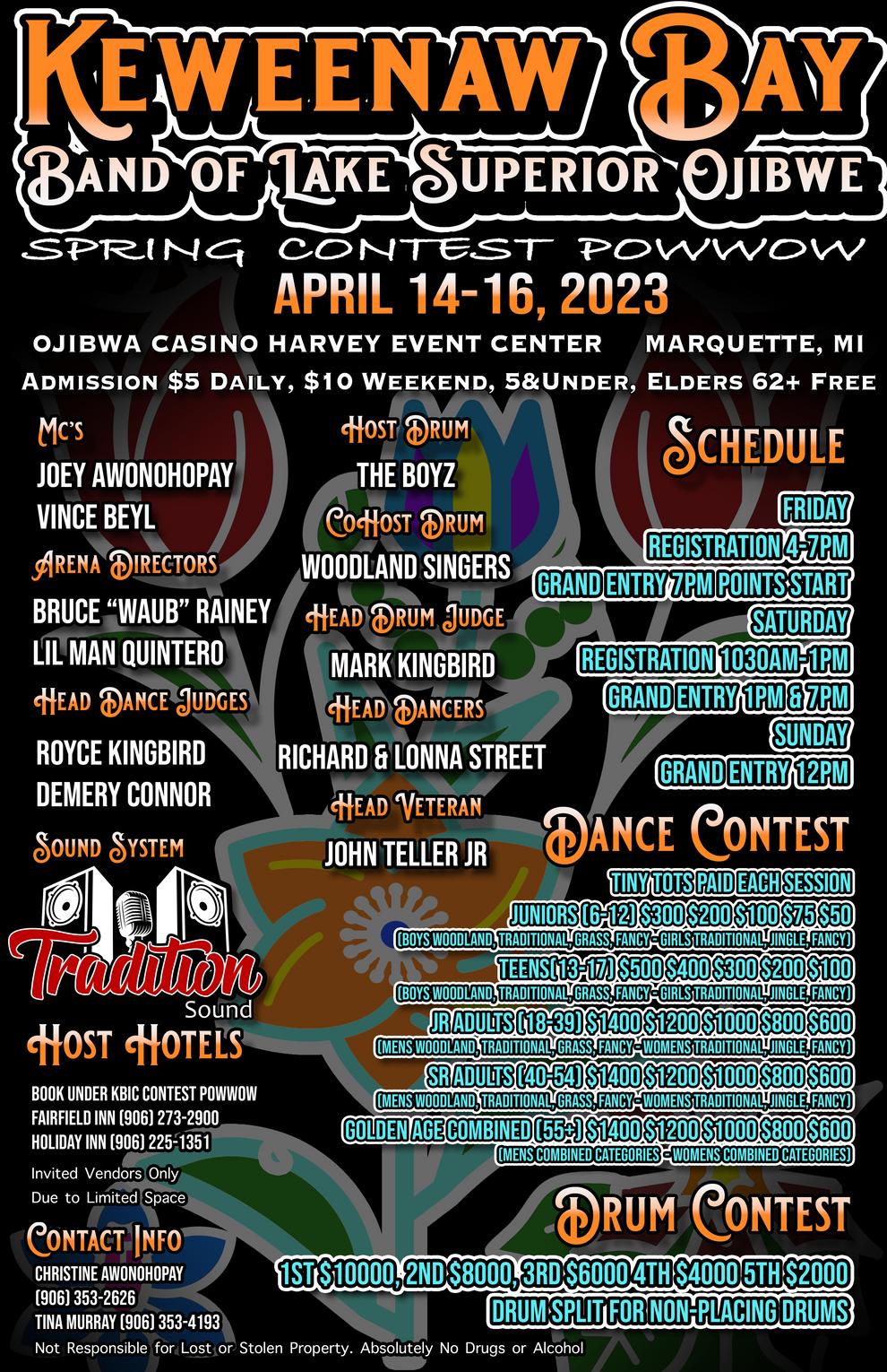 A cold winter day brought many travelers and community members into the warmth of the Niiwin Akeaa Community Center gymnasium for the 17th Winter Traditional Pow Wow. The KBIC Cultural Committee hosts this yearly event, which spends months preparing. Grand entries were held at 1 PM and 6 PM with Head Veteran Dancer Lawrence Williams, Veteran Honor Guard