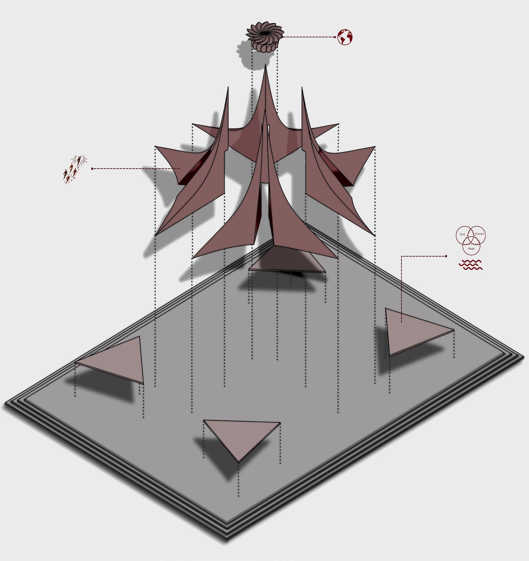 This project is a conceptual monument designed to commemorate the victims of nuclear weapons and serves as a powerful reminder of their devastating impact. Located within a decommissioned nuclear testing site, the memorial merges symbolism and architectural innovation to inspire reflection and empathy. The memorial’s spatial experience invites visitors to journey through the space, engaging with the interplay of light and shadow, life and death, fragility and strength. The contrast between the glass flower and the solid concrete towers symbolizes the dichotomy of sorrow and hope. Inspired by the competition’s theme of silence and visual storytelling, the design speaks through its form and materials. It creates an immersive environment where visitors can reflect on the past, honor the memory of the victims, and gain a renewed appreciation for peace and humanity. This project aligns with the competition’s mission to use architecture as a medium for powerful social commentary, ensuring that the message of the monument transcends generations and cultural boundaries.