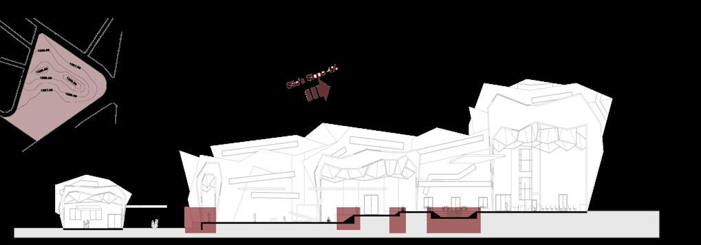This project explores the impact of time on human culture through the design of a cultural center. Located in a site with a mountainous backdrop, the center creates a harmonious connection with its natural surroundings. The center includes spaces for the public, such as a gallery, cinema, theater, library, and educational areas. The lower part of the site features a fexible and adaptable space that can cater to various user needs. The building consists of different volumes connected by ramps of varying heights, giving the architecture a dynamic and expressive form. The aim of the project is to express the temporal dimension of architecture and emphasize the importance of using time wisely.