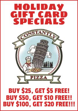 Constantly Pizza combines a passion for good food with generations of Italian family recipes to provide you with the best meal in town. Available as gift cards or for the ultimate meal catering, call today!