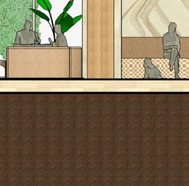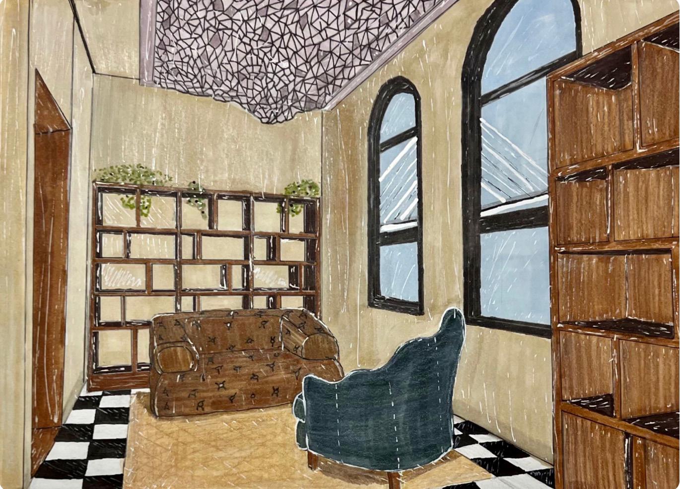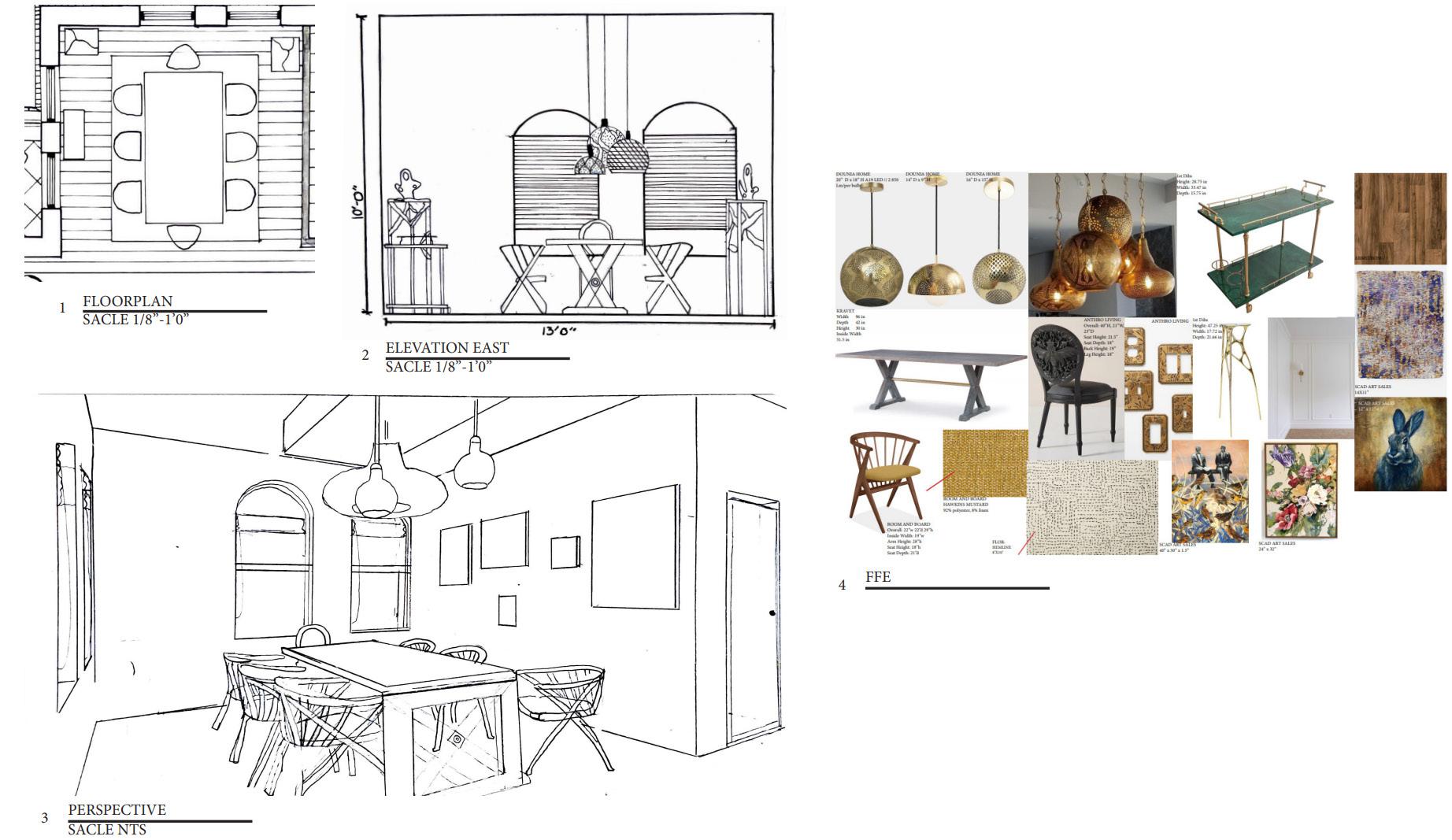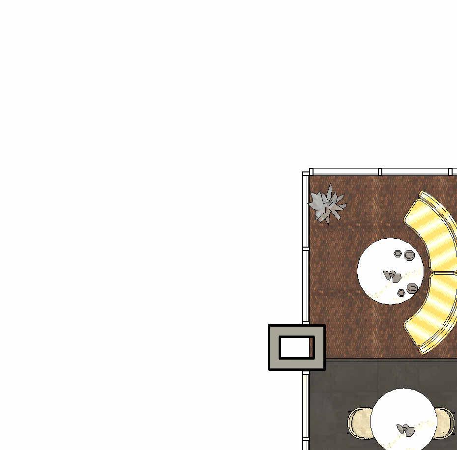 The concept of Nostalgic Serenity focuses on bringing the client back to their creative roots. Symbolic elements are placed throughout to create the sublime. By bringing the serene outdoor environment within the space with the use of texture. Proportion and scale are used to define the space to be a collaborative while creating unity. With Pops of bold colors to create emphasis and hierarchy. The use of Natural and Artificial light establishes balance and rhythm.