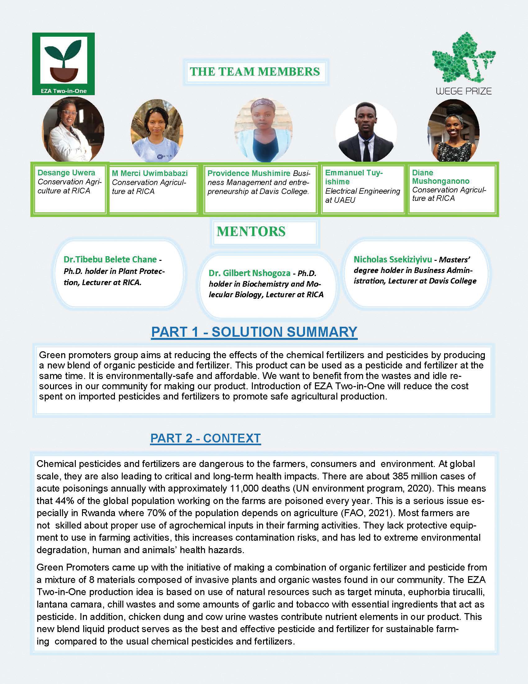 When asked about what he learned from Wege Prize, Tennyson mentioned, “We have learned that solving real problems requires real solutions that are not only economically feasible but also regenerative. We have also learned that success requires preparation and analytical skills. Through participating in Wege Prize, we have gained skills in project analysis and implementation, which are skills that we didn’t have before joining the Wege Prize community.”