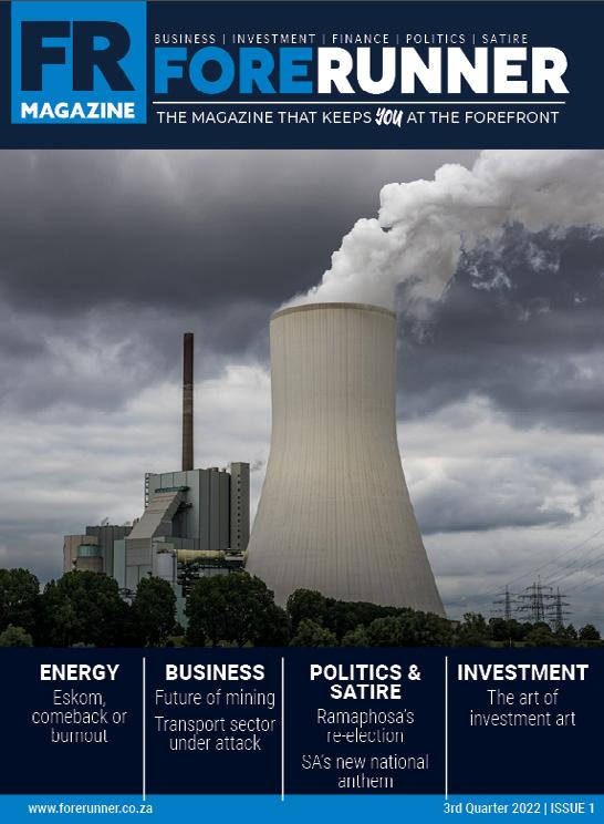 THE M A GAZINE TH AT KEEPS Y OU AT THE F ORE F RON T BUSINESS | INVESTMENT | FINANCE | POLITICS | SATIRE www.forerunner.co.za 3rd Quarter 2022 | ISSUE 1 ENERGY Eskom, comeback or burnout BUSINESS Future of mining Transport sector under attack POLITICS & SATIRE Ramaphosa’s re-election SA’s new national anthem INVESTMENT The art of investment art