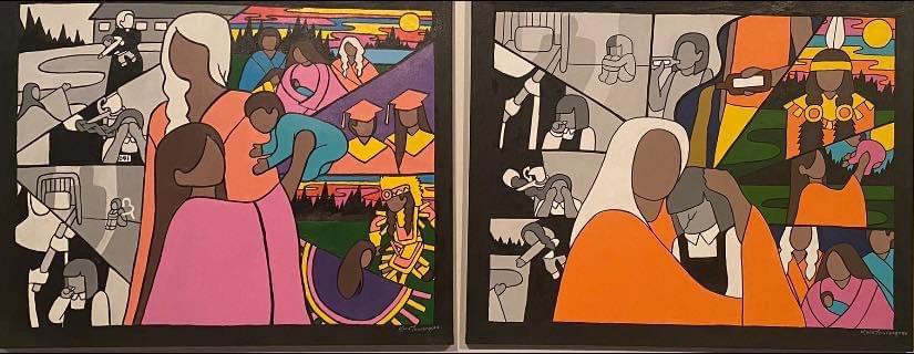 “The painting Future Generations was inspired by the stories of residential school survivors who had the strength to overcome their traumas and continue to embrace our culture. Resiliency to me looks like our ancestors and our future generations who continue to heal and head toward brighter futures. Since completing the first artwork, I have since created a second titled Healing. This piece was mostly inspired by the woman who raised me, my grandmother, who was a residential school survivor. This piece was tailored to the stories she shared with me. The trauma she faced, the alcoholism she struggled with, and how she had to heal her own inner child, representing the broken child being in a warm embrace. She is one of the most resilient and inspirational people I know.”