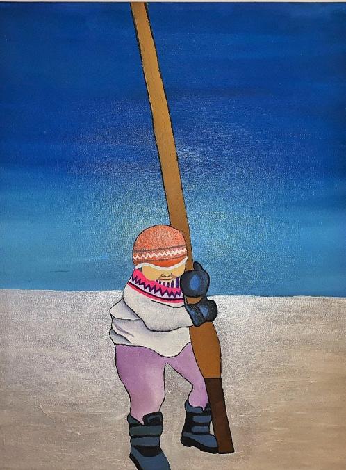 “A little girl using a Tuuq (ice chisel), a tool essential for Inuit to survive in the Arctic, to access food and water. The little girl is using the Tuuq as a symbol of strength and resilience; as a visual of being carried by the next generation.”