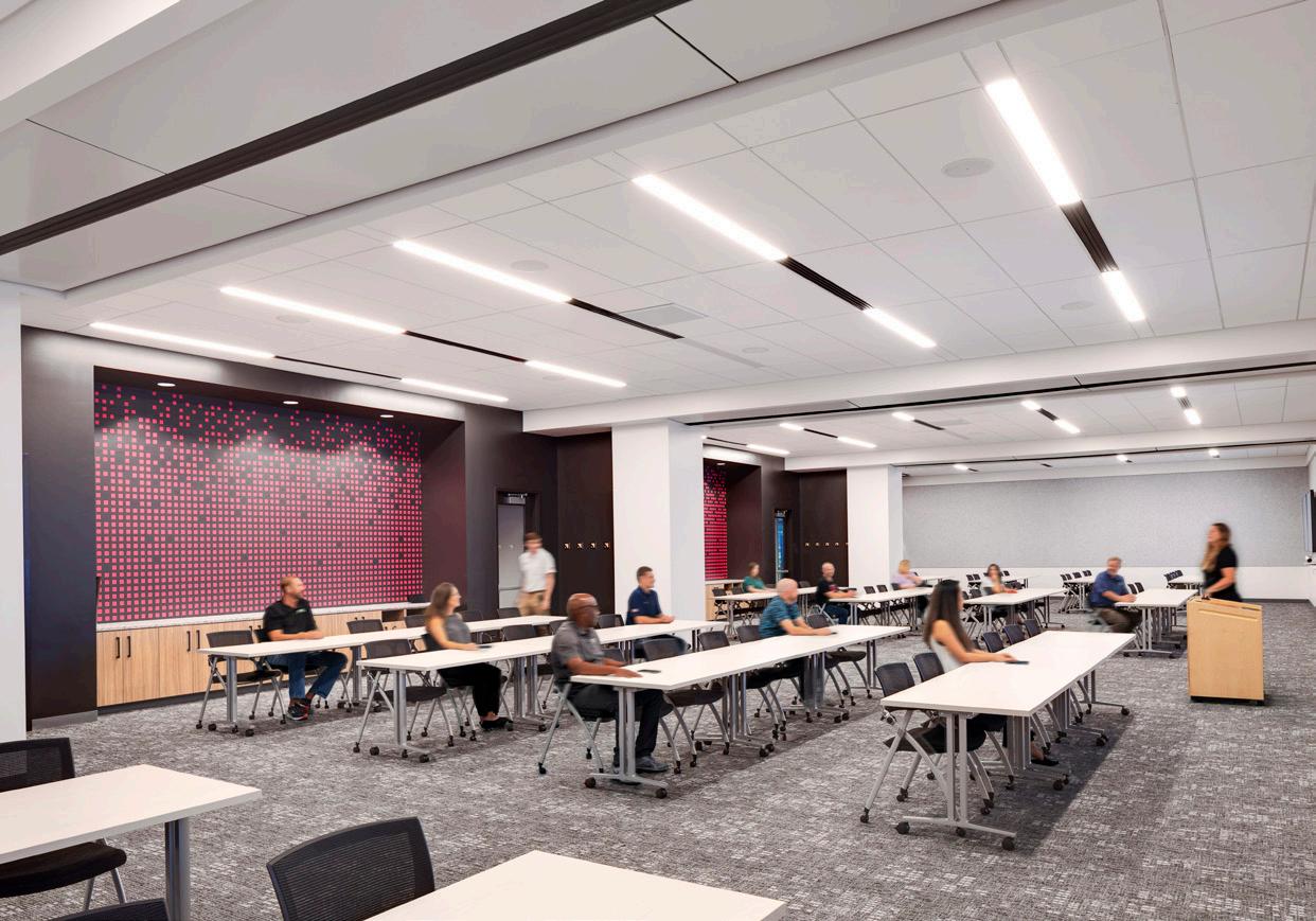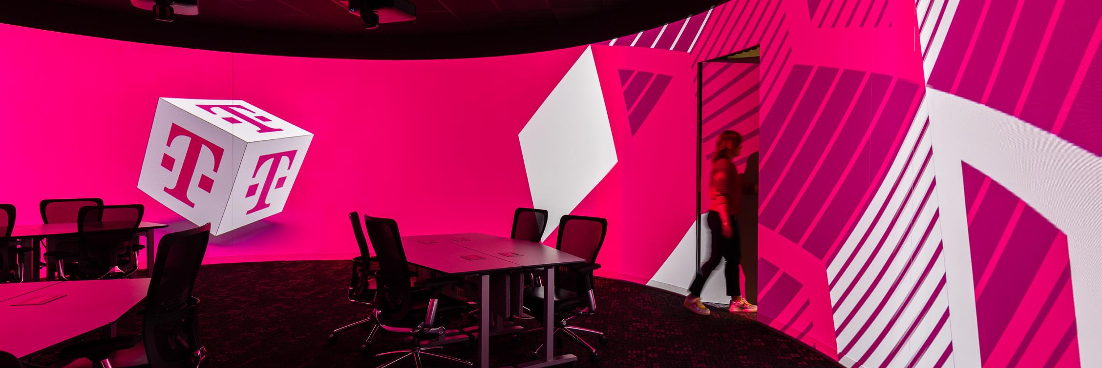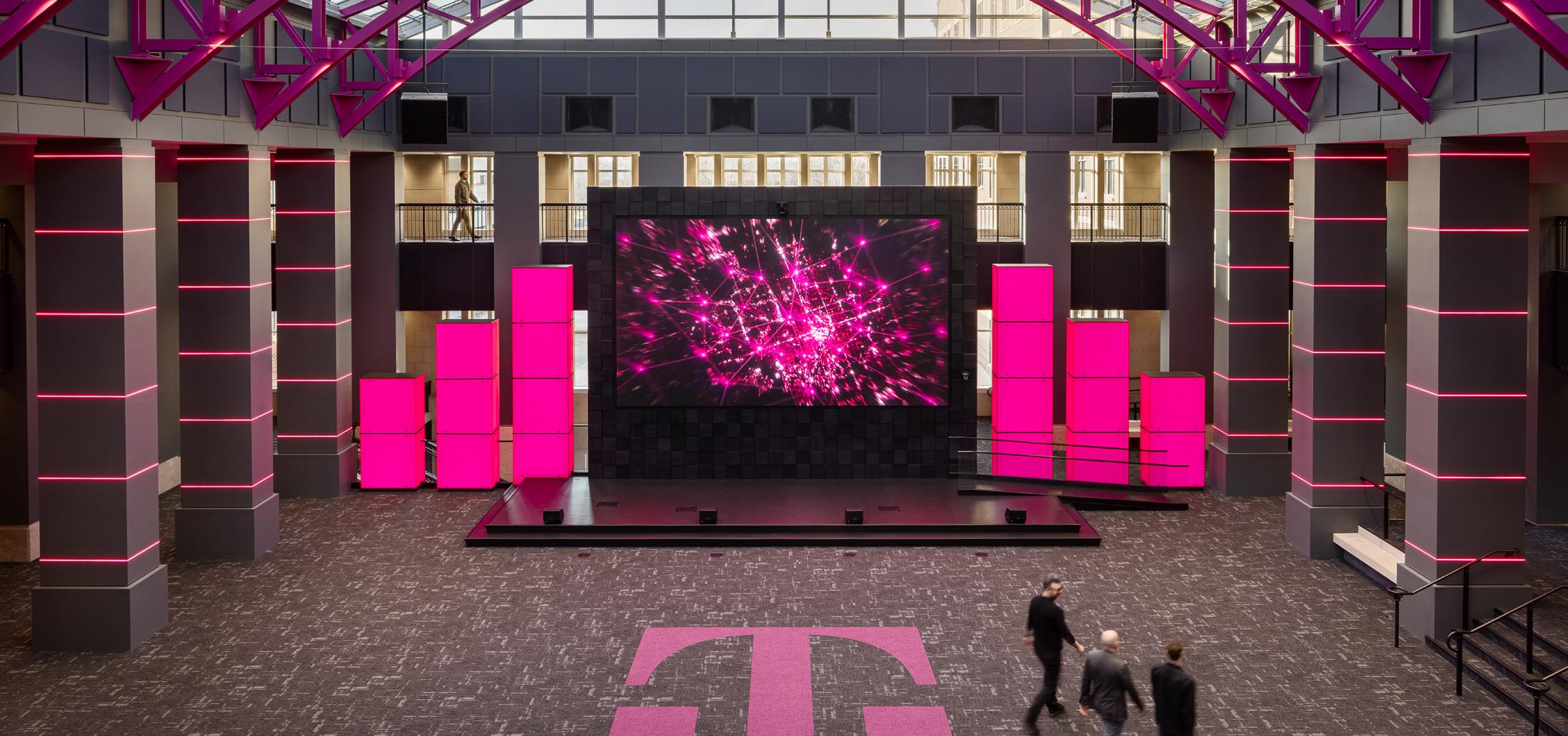 Reimagined collaboration areas create exceptional user experiences with robust technology integration and magenta branding. T-Mobile’s 12,500 sf atrium event space boasts a premium audio-visual system including a giant LED wall, speech and music audio system, and seamless integration with Cisco WebEX video conferencing.