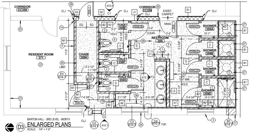 Multi-phased renovation of existing restrooms in historic dormitory buildings on Iowa State’s campus, including Barton, Birch, Freeman, Lyon, Roberts, and Welch.