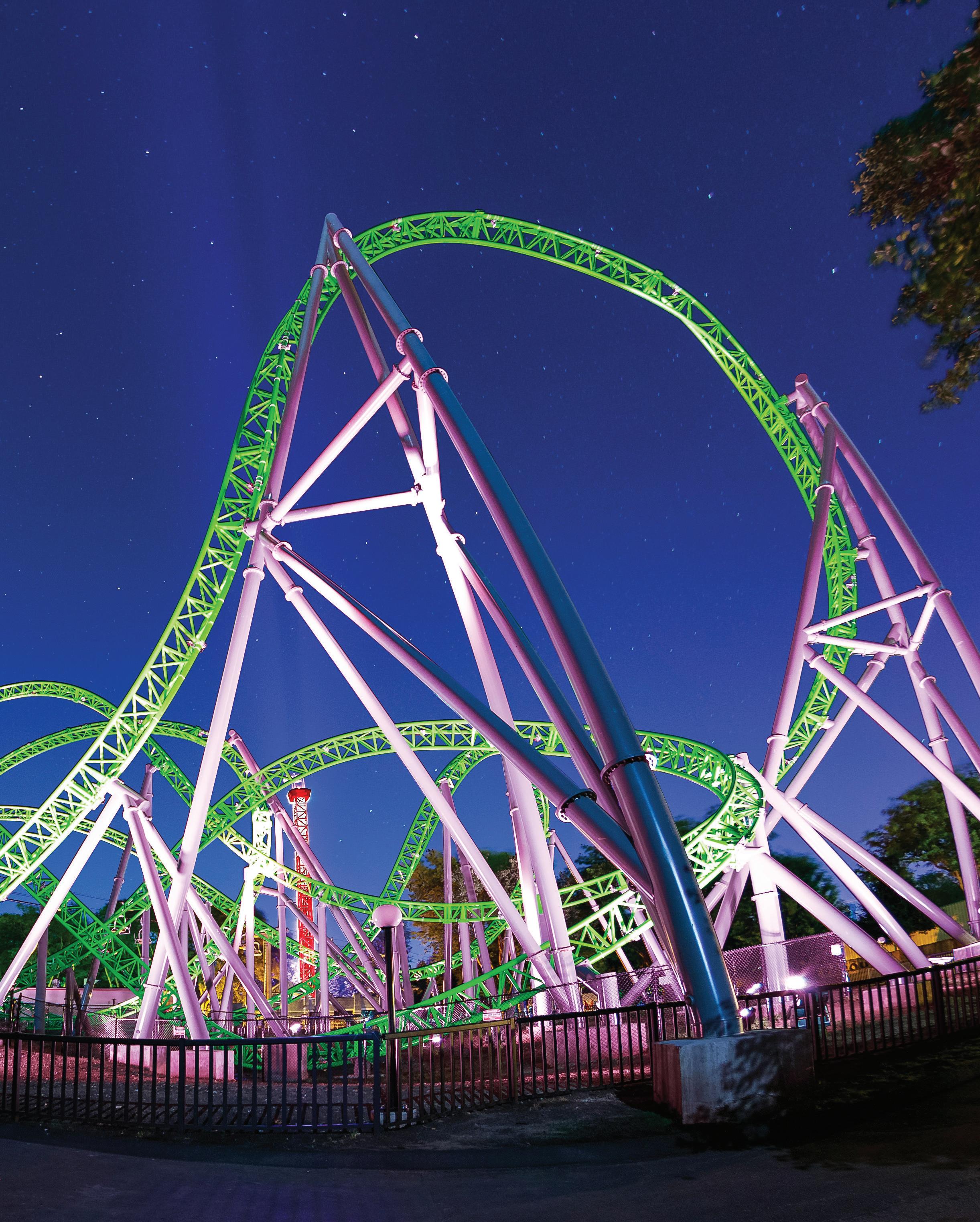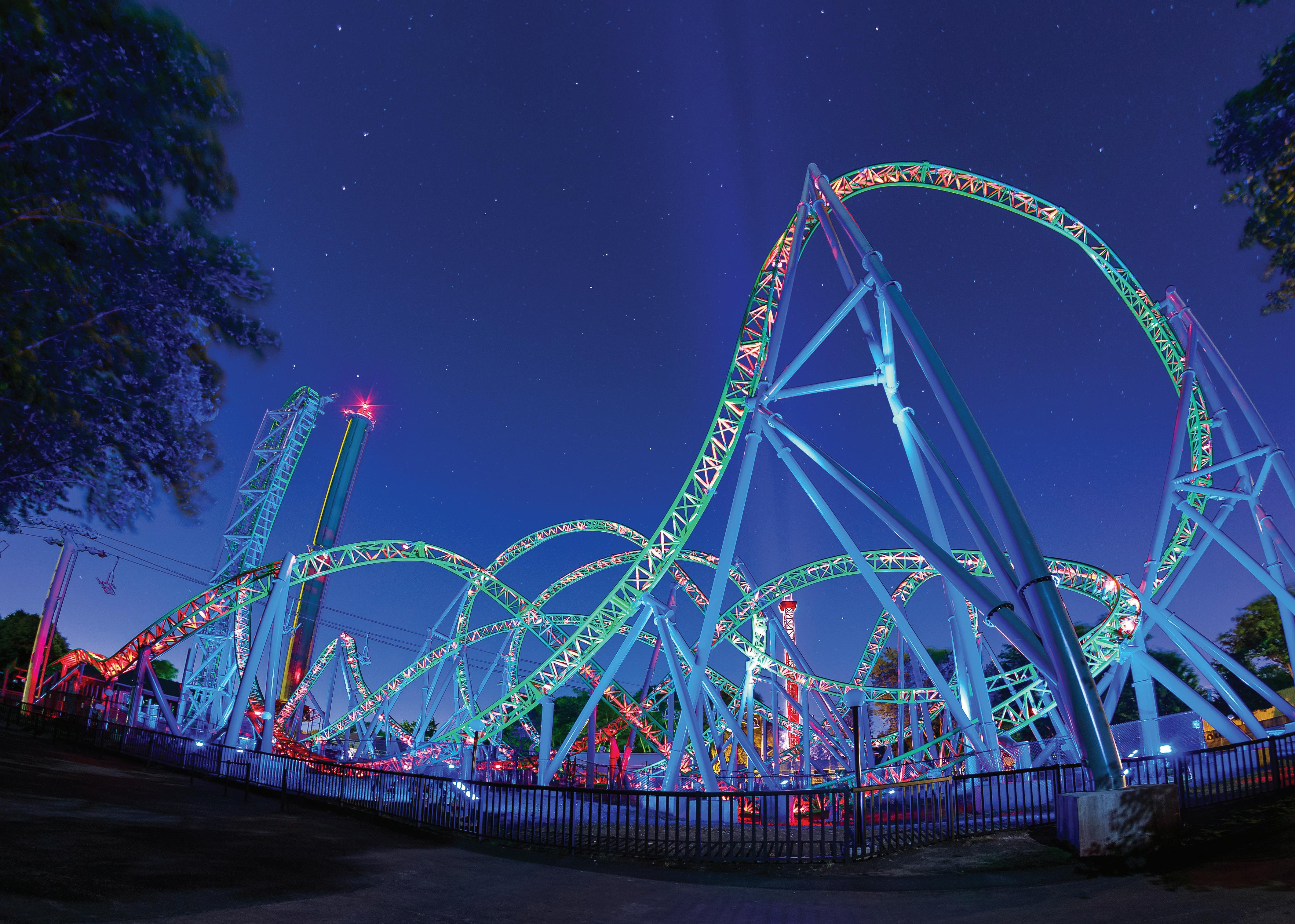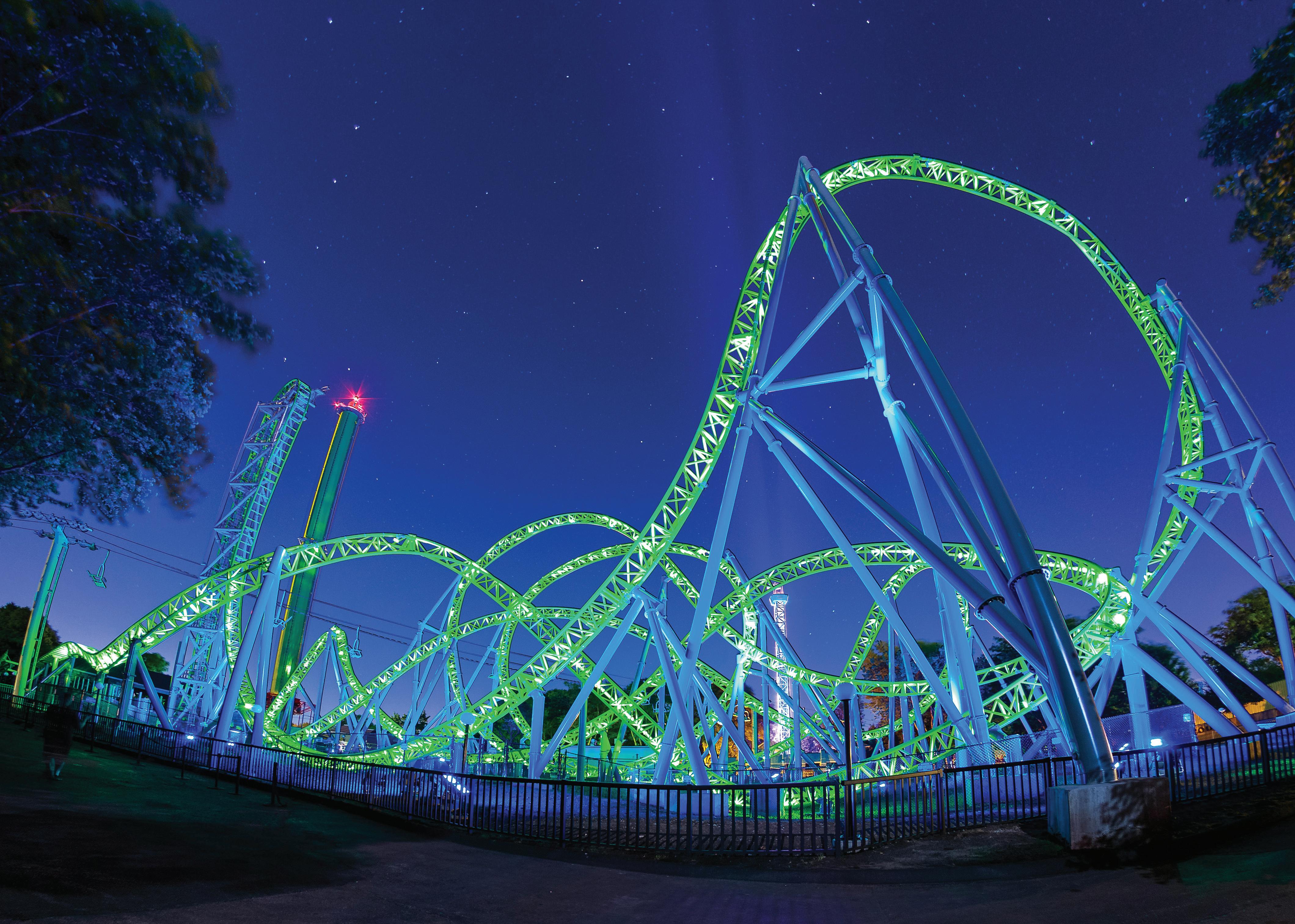 The Monster debuted as Adventureland Park’s first new ride in 20 years with a lighting system that was first of its kind in the world. The combination of color-changing ground mounted LED lighting and dynamic color-changing track lighting with unlimited programming abilities provided an intrigue and emotional thrill found on no other roller coaster on the globe.