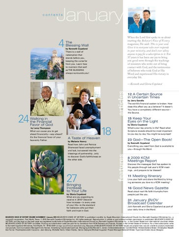 BELIEVER’S VOICE OF VICTORY VOLUME 38 NUMBER 1 January 2010 BELIEVER’S VOICE OF VICTORY is published monthly by Eagle Mountain International Church Inc./Kenneth Copeland Ministries Inc., a nonprofit corporation, Fort Worth, Texas. © 2010 Kenneth Copeland Ministries Inc. All rights reserved. Reproduction in whole or part without written permission is prohibited. BELIEVER’S VOICE OF VICTORY and the logo on the back page are registered trademarks of Eagle Mountain International Church Inc./Kenneth Copeland Ministries Inc., in the United States and international countries where BELIEVER’S VOICE OF VICTORY circulates. Printing and distribution costs are paid for by donations from KCM Partners and Friends. Printed in the United States of America. For a free subscription write to Kenneth Copeland Ministries, Fort Worth, TX 76192-0001 or sign up online at www.kcm.org. Because all BELIEVER’S VOICE OF VICTORY issues are preplanned, we are unable to accept unsolicited manuscripts. Communications Manager/Cindy Hames Advertising Coordinator/Leah Lee Managing Editor/Ronald C. Jordan Editors/Deborah Ide Camille Wilder Writers/Darlene Breed Christopher Maselli Don Turner Proofreaders/John Caccomo Jean DeLong Michelle Harris Eileen Hooley Senior Designer/Michael Augustat Project Manager/Deborah Brister Type Coordinator/Joyce Glasgow