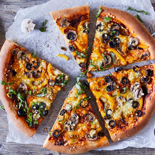 VEGETARIANA PIZZA munakoiso, kesäkurpitsa, paprika, tomaattikastike, mozzarellajuusto, oregano, basilika