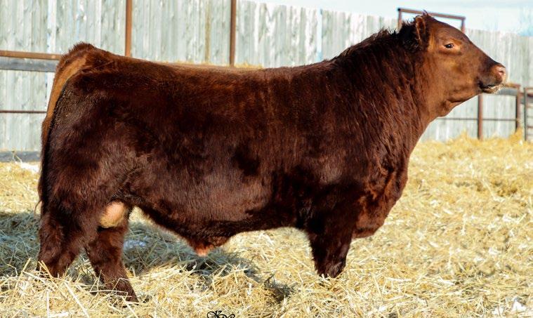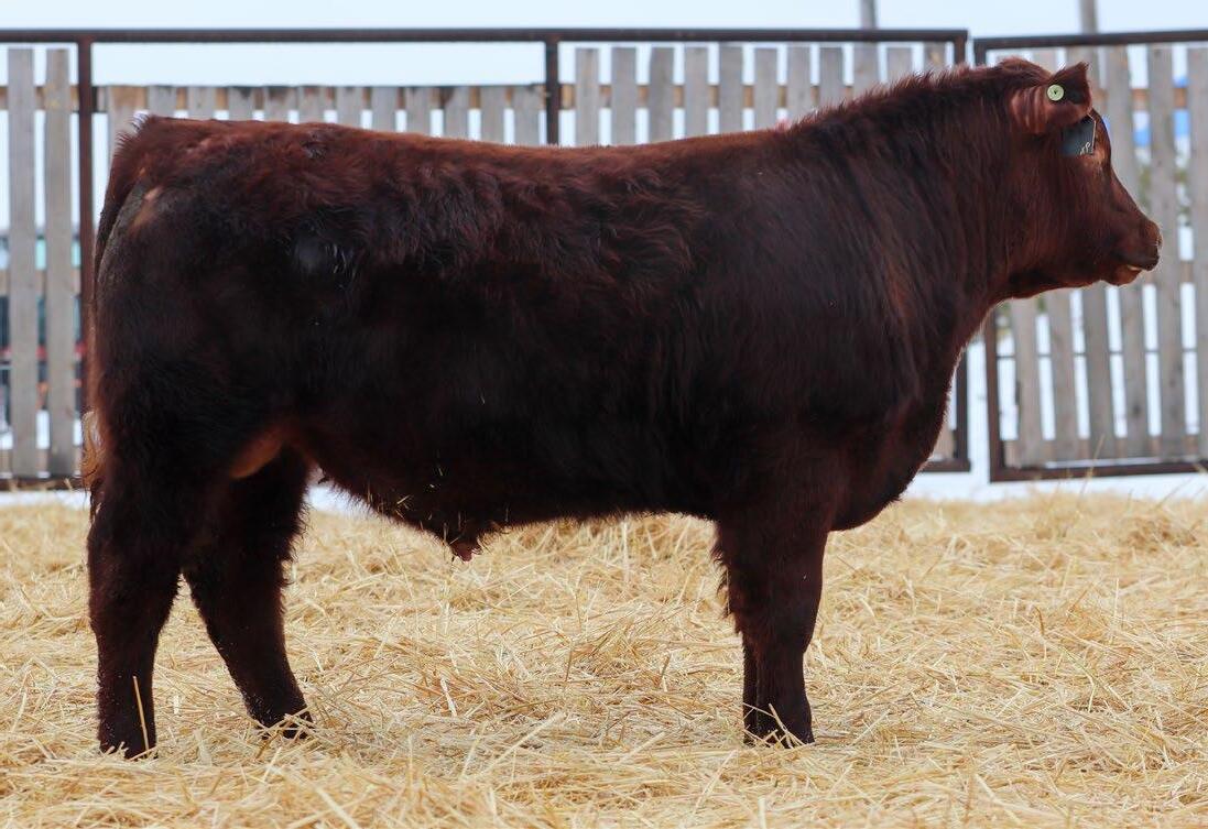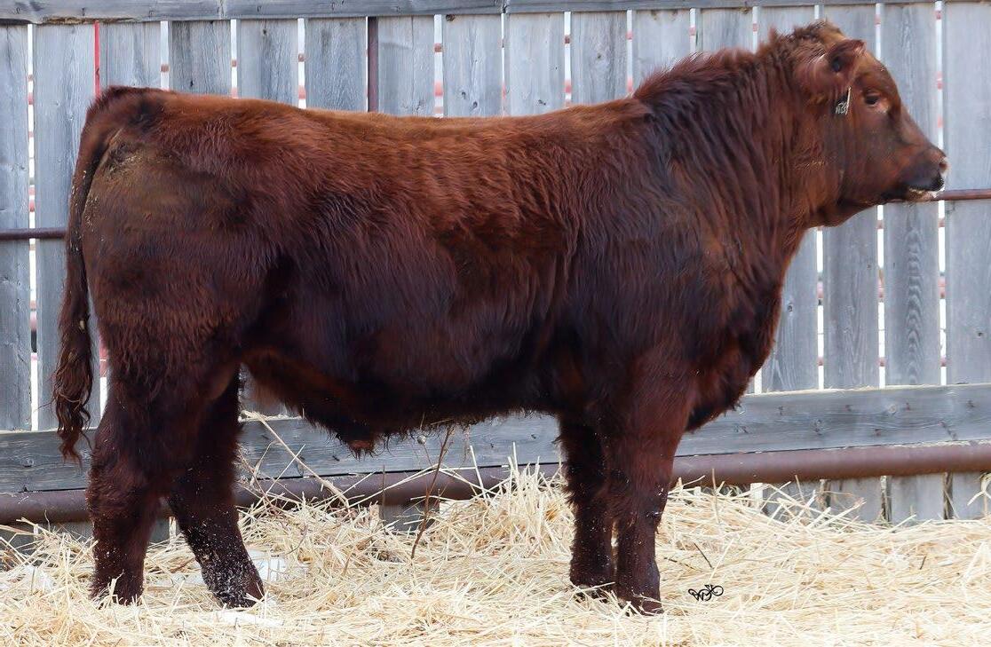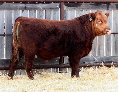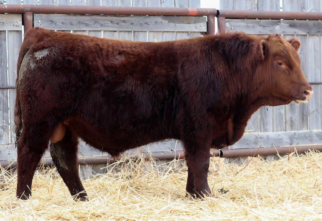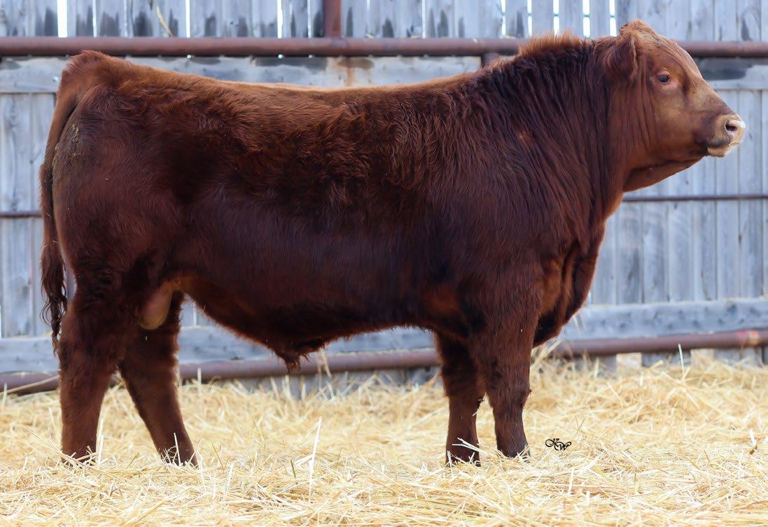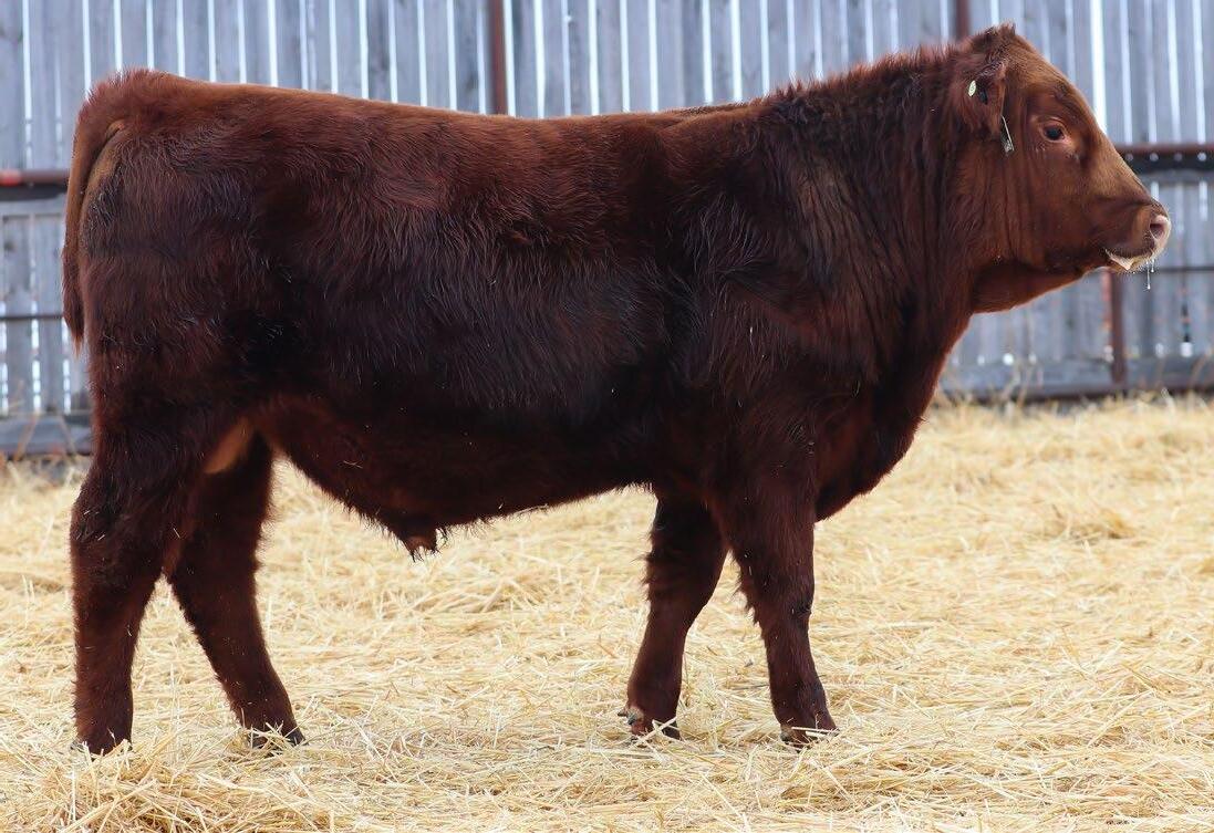 Our only red bull this year! Out of a dark red female who has produced in our herd for many years, always raising top end calves! This guy is as long as a freight train, extended up through his neck and very clean sheathed.