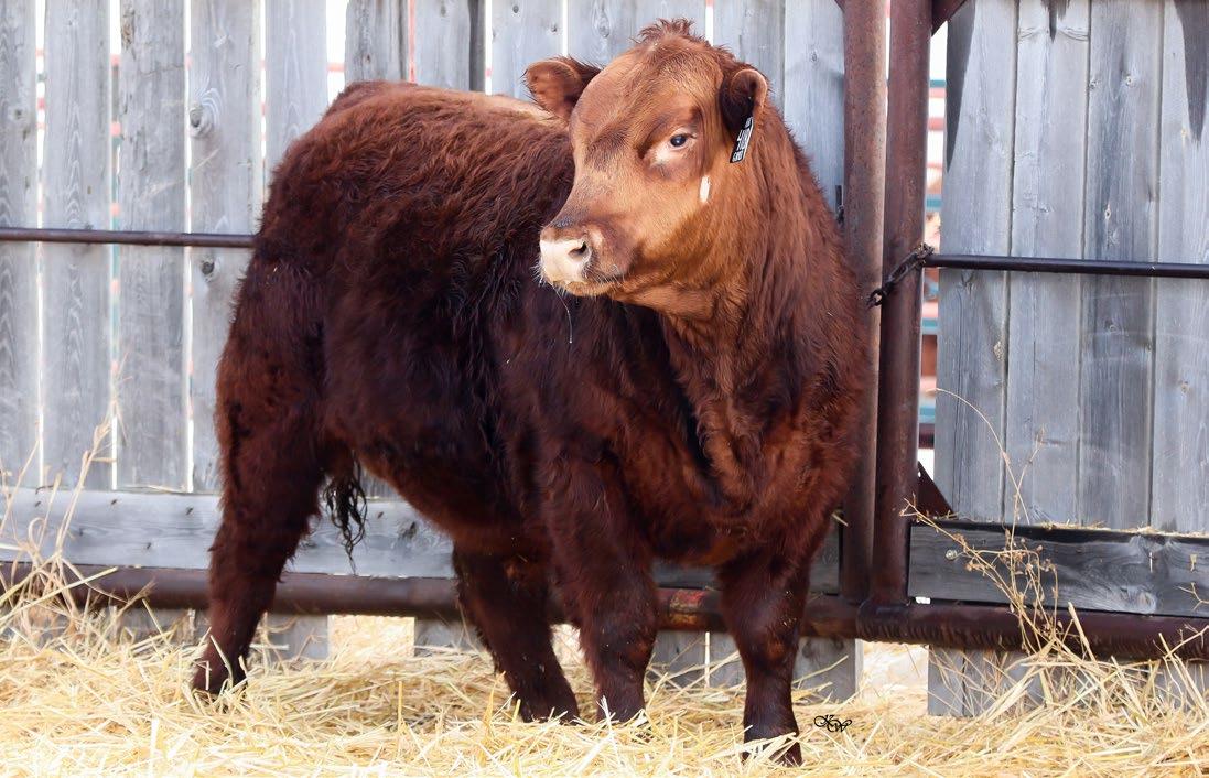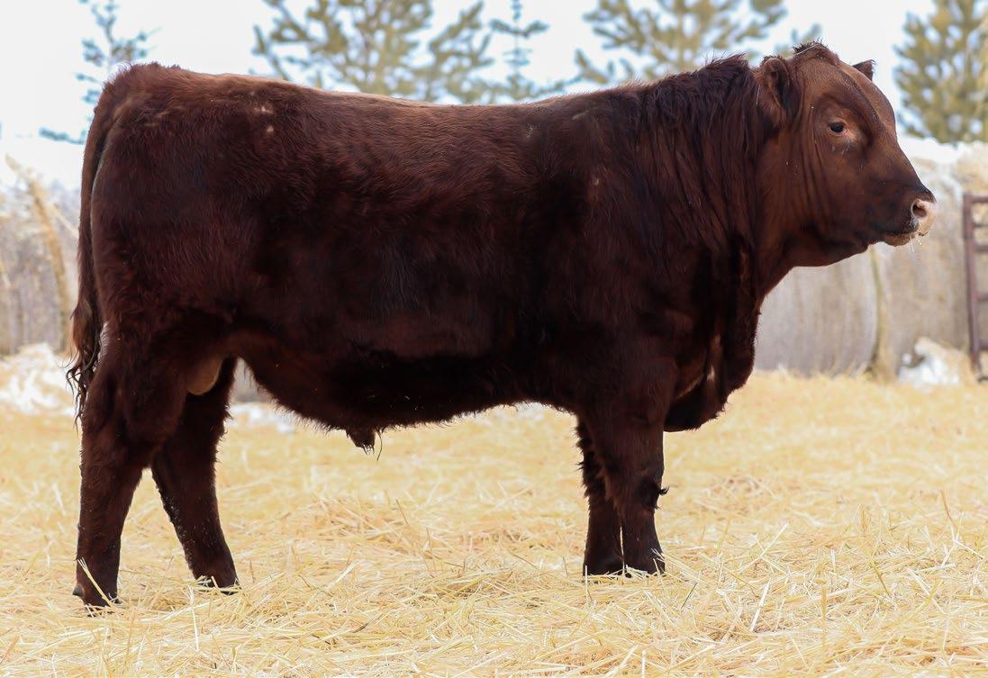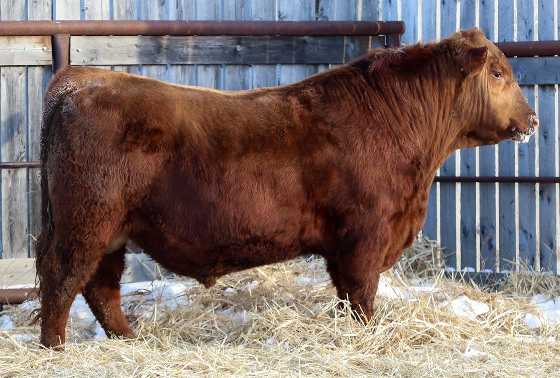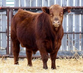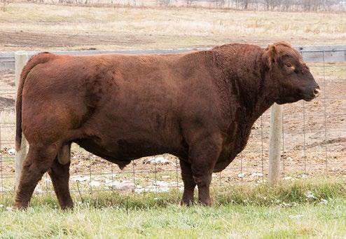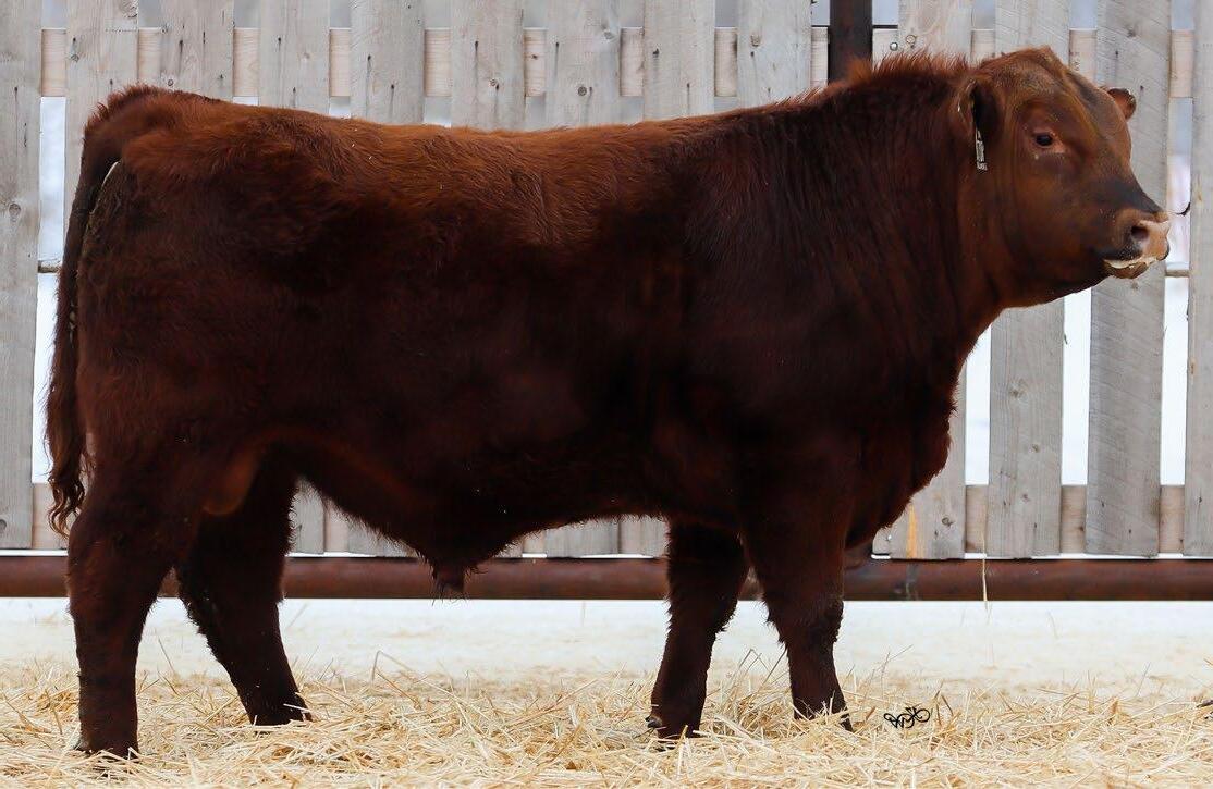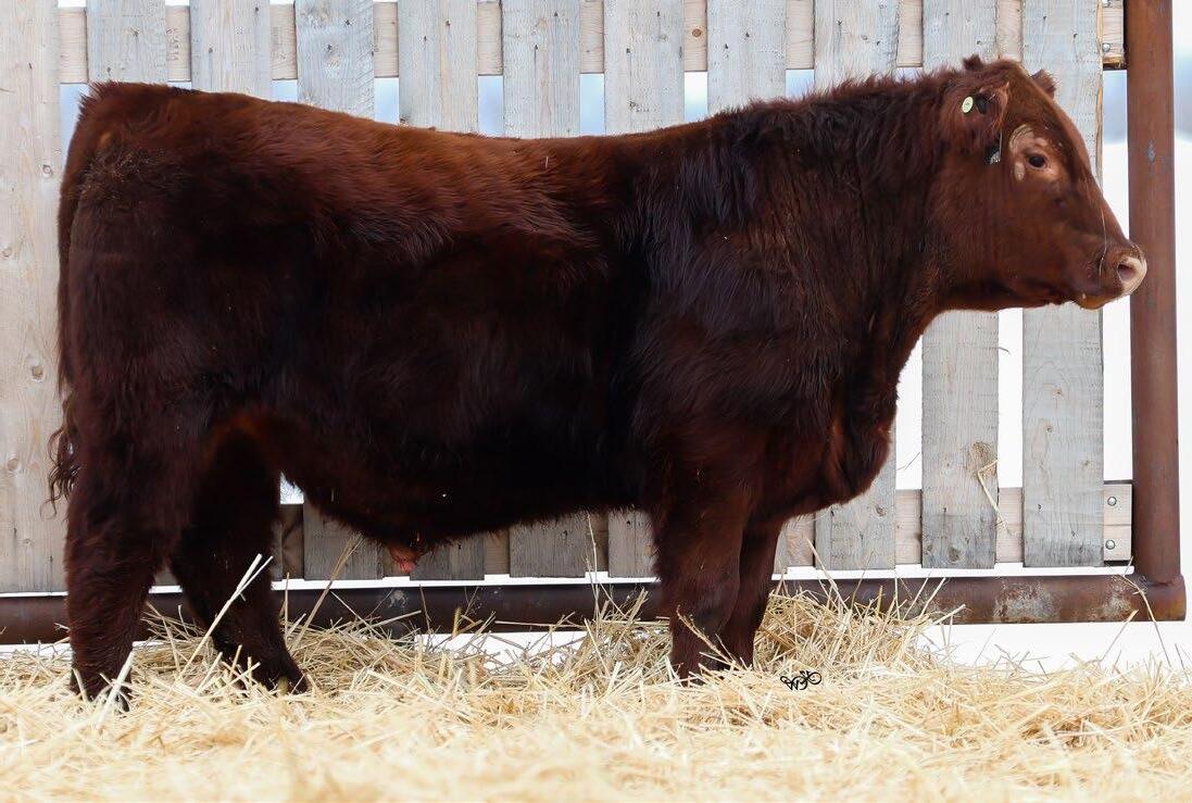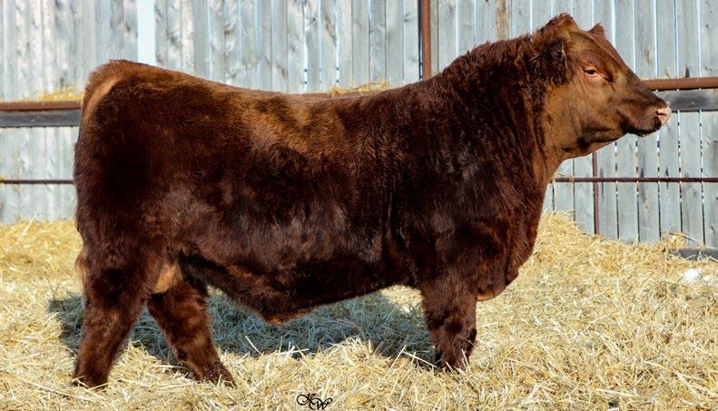 Our only red bull this year! Out of a dark red female who has produced in our herd for many years, always raising top end calves! This guy is as long as a freight train, extended up through his neck and very clean sheathed.
