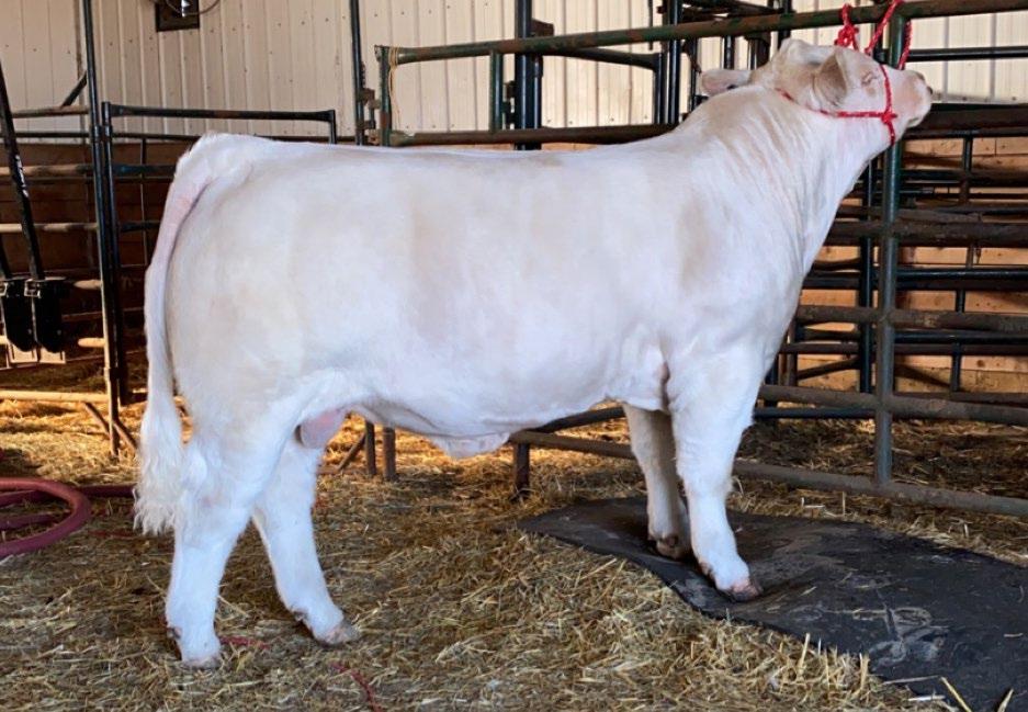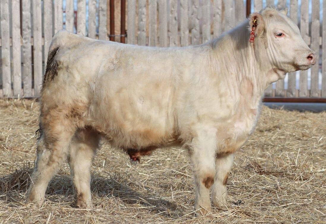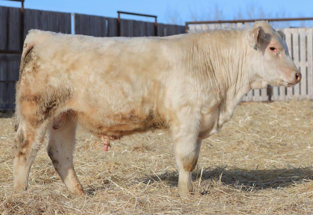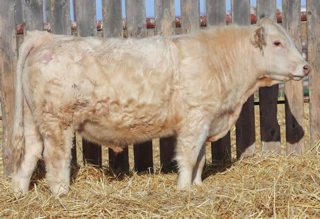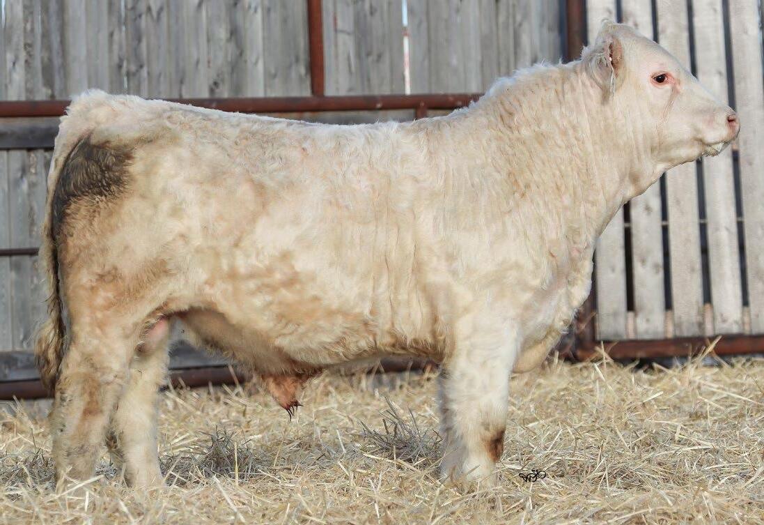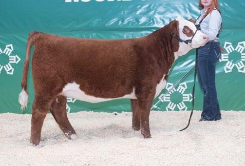 Sharp and clean fronted with an excellent skull structure. Big hipped with lots of middle, excellent weaning weight of 715lbs.