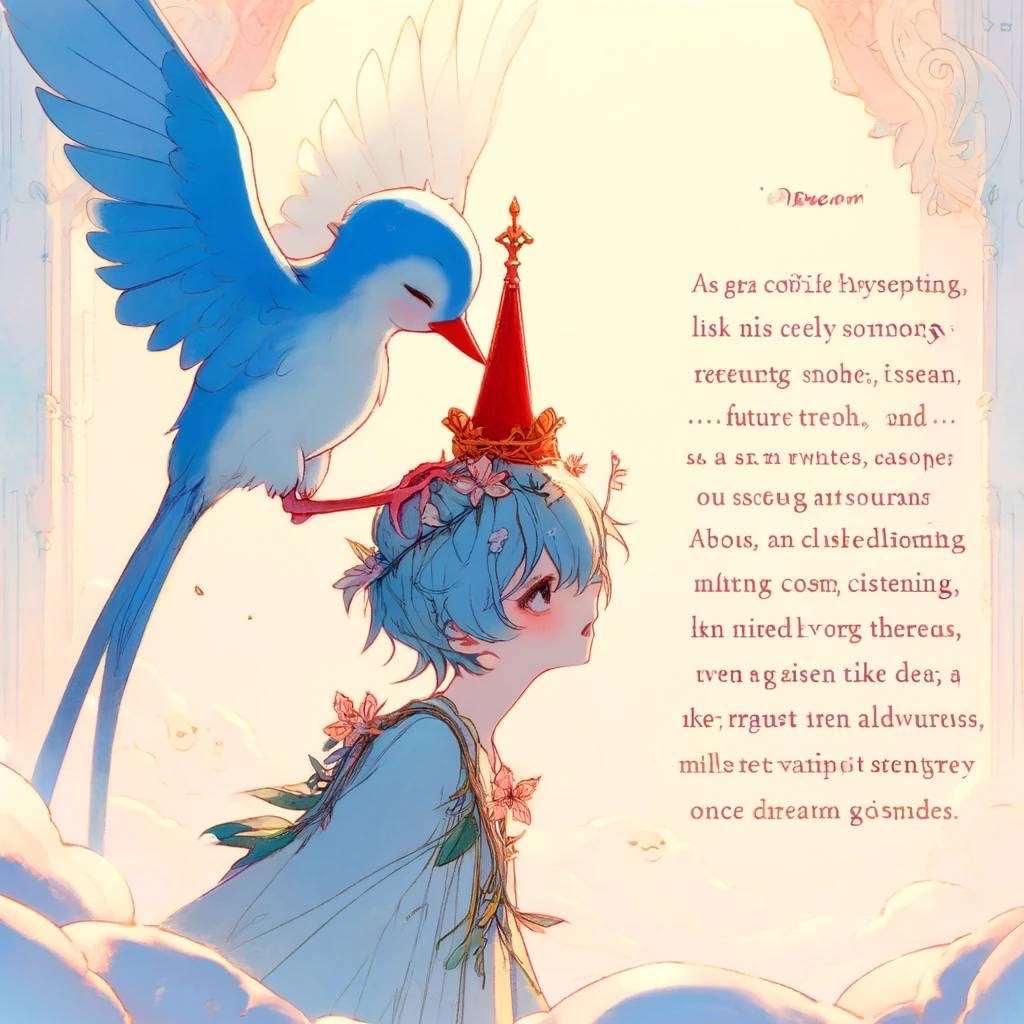 青鳥在夢想的頭頂插上紅色的尖塔,象 徵鼓勵的加冕,再用翅膀搧涼它冒汗的 鬢角,嘴兒正好拿來輕啄害羞的臉頰, 甜甜追問過往的迷路故事,以及未來可 能發生的承諾。
