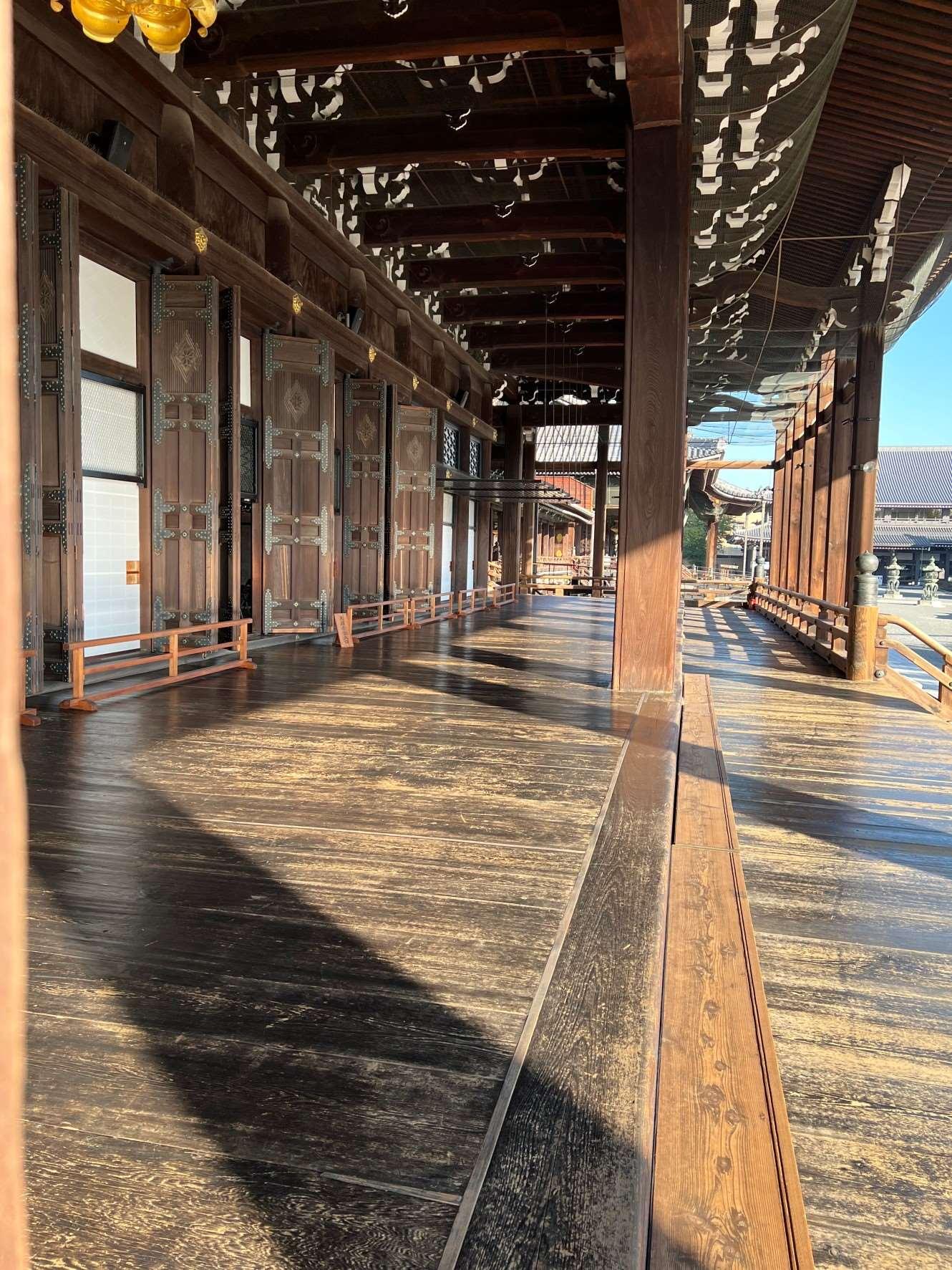 心靈結的累累疤痕,只讓晨光 撫摸。滄桑踩著廊道而去,天 下全在腳底。我想轉身,御影 堂的木造雍容才打點光就搶走