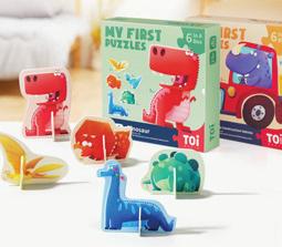 Double-sided puzzle pieces feature dinosaurs on one side and bones/skeletons on the other. Great for building problem-solving skills and imagination. The number of pieces increase step-by-step to challenge toddlers through their developmental growth. $13.99, ages 2-4, Toiworld.com