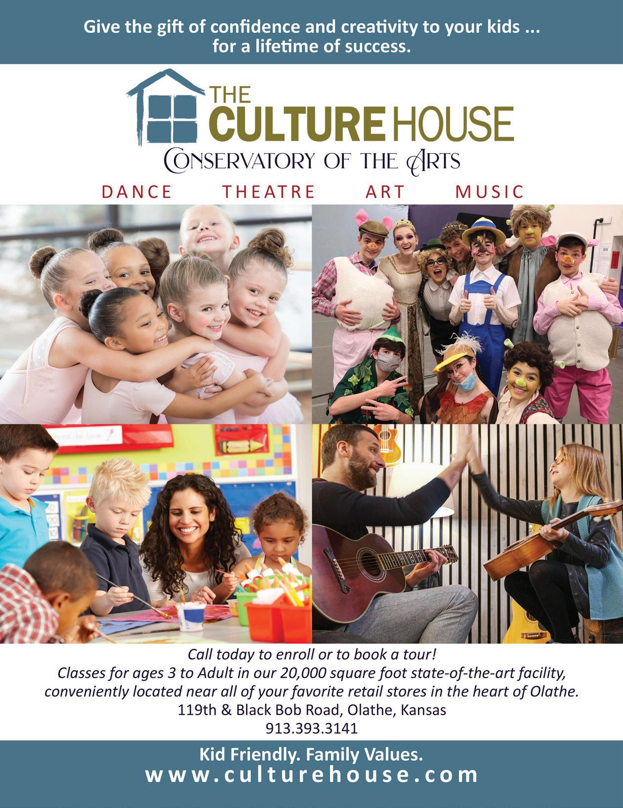 Conservatory of the Arts Kid Friendly. Family Values. 913-393-3141 www.culturehouse.com DANCE THEATRE ART MUSIC 20,000 sq. ft.facility near119th & Black Bobin Olathe! est. 1996 SPRING CLASS ENROLLMENT WILL BEGIN VERY SOON! THERE IS STILLTIME TO ENROLLIN FALLDANCE & CLASSES!MUSIC