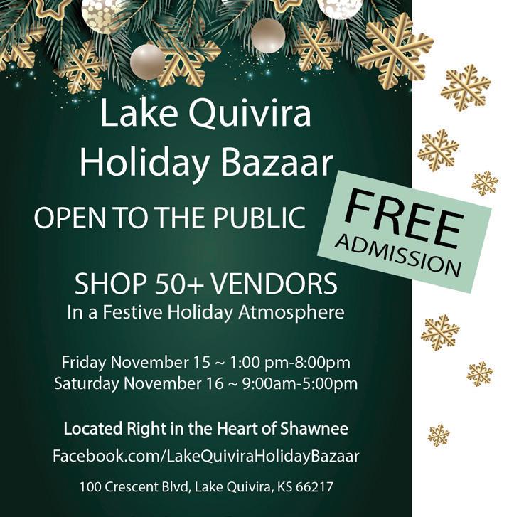 Lake Quivira Holiday Bazaar 1:00, Lake Quivira Country Club. Shop FREE with over fifty art, decor, clothing, and holiday vendors. Facebook.com/lakequiviraholidaybazaar