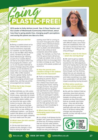 make changes and coming up with different ideas; once those ideas are established, then we can start to introduce them in to the school. The challenge has only just begun. Q: What’s in store for the future – what’s the next big thing? A: We want to get our plasticfree status, and we’re working towards the five SAS objectives, and we’re hoping that, by the end of the year, we should be able to achieve that! It doesn’t just stop there though; we’ll be thinking about how we can educate our children to think beyond plastic, and make everything in our daily lives sustainable. It will definitely impact everything moving forward. Q: What advice would you give other schools looking to implement this initiative? A: Go with the children! Hold an assembly, show them pictures, talk about the problem; they’re fantastic at coming up with solutions as they think of things that we, as adults, don’t think about – they see all the little things going on in schools, so definitely start with them. After that, it’s all about making little changes and educating the parents, as they will help nurture ideas at home.