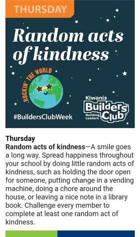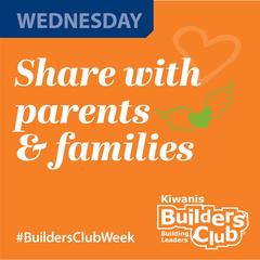 Share your Builders Club and your passion for serving others with your biggest cheerleaders your parents! Host a showand-tell your party to show off the club’s work, make a special presentation, invite local organizations your club has helped to speak on your club’s impact or invite the sponsoring Kiwanis club to share the mission of Kiwanis and your club’s impact.
