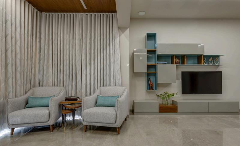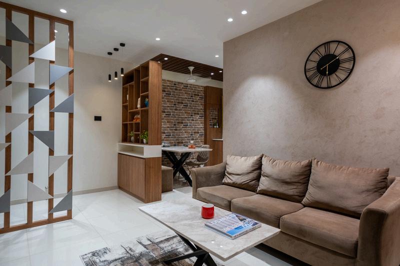 The Agrawal family's compact residential apartment design is a harmonious blend of simplicity and regal elegance. The theme of their home exudes a simplistic fusion style, incorporating elements that showcase both modernity and tradition.